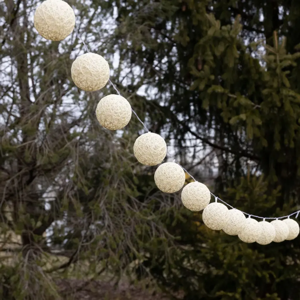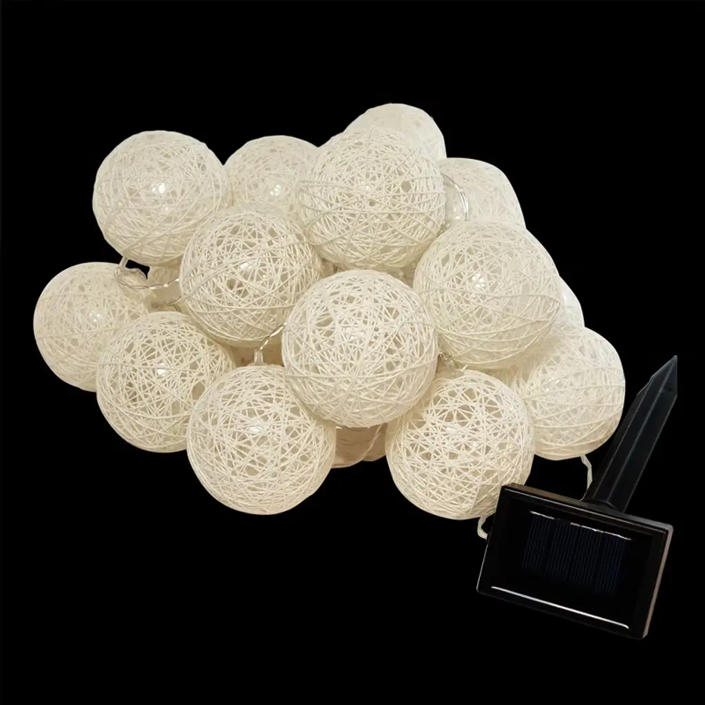 Create a chic atmosphere to your outdoor décor with solar-powered string lights. The globes, wrapped with cream-colored cotton thread, are charged by the sun during the day to provide a beautiful effect at night. The convenience of the solar panel with AA-Ni-MH battery allows you to place these string lights anywhere outdoors. Simply place the solar panel in a sunny spot during the day to charge and the LED lights will glow at dusk. The ambient glow adds perfect accent lighting to a patio, porch, deck, trees, roof tops, or a patio umbrella. These long-lasting string lights will provide your outdoor décor with a festive feel. Charge in full sun for 8 hours prior to first use.