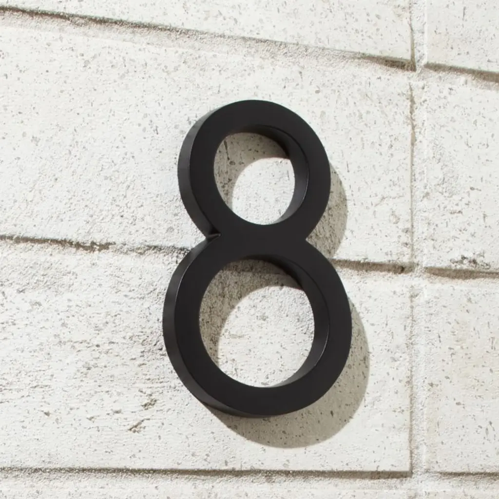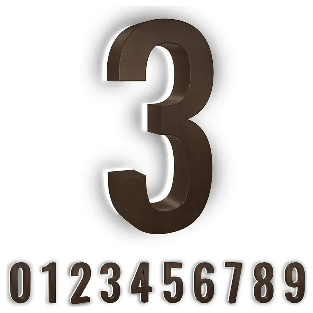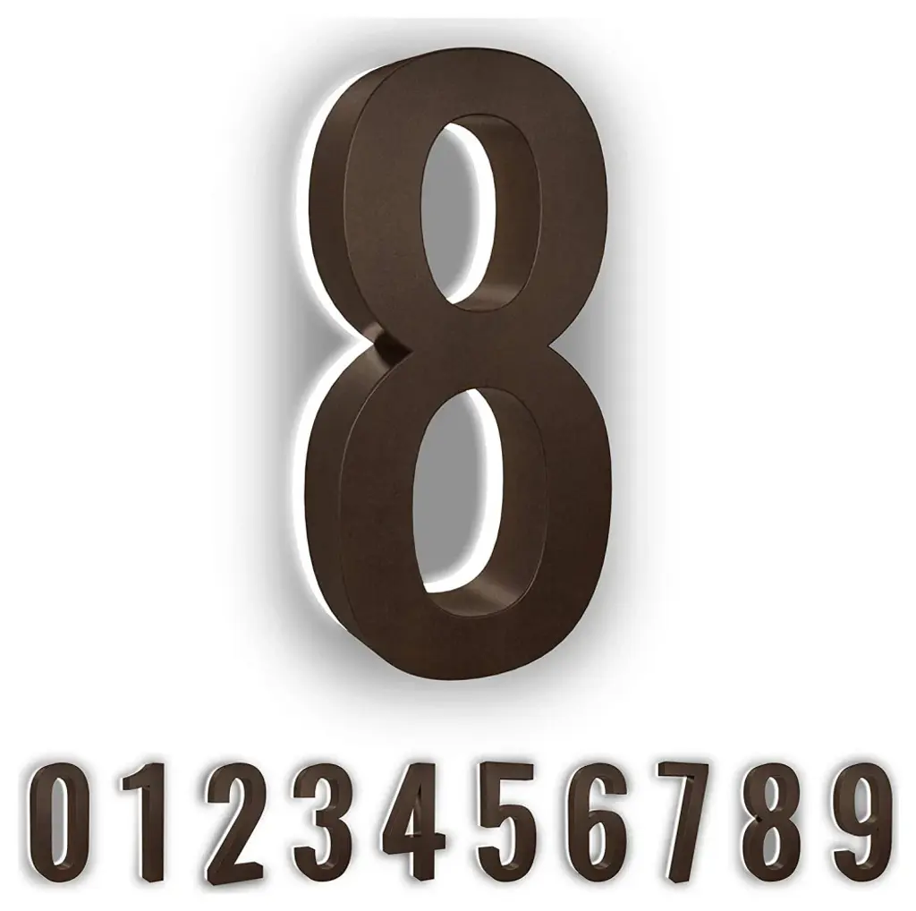 Back-lit numbers from Modern Lights will add a contemporary touch to any building or home. Available in 3 different finishes: Black, Bronze or Brushed nickel. Installation required, hardware included. UL approved. Uses one 12V LED lamp bulb, Transformers sold separately.