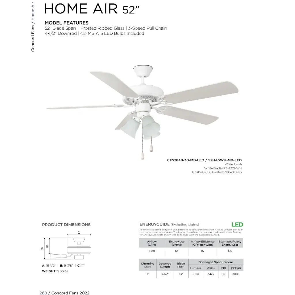 Luminance Concord 52" Ceiling Fan with Three-Light Kit, White Finish Bring classic charm and cooling comfort to your space with this 52" traditional ceiling fan in a clean white finish. Its integrated three-light fixture and UL listing make it a dependable choice for dry indoor areas. Key Features: • 52" blade span with matching white blade finish • Traditional style with integrated three-light kit • Includes three 6.5-watt LED bulbs • UL Listed for dry locations • Assembled dimensions: 52" L x 52" W x 19.36" H • Clean white finish complements most interiors