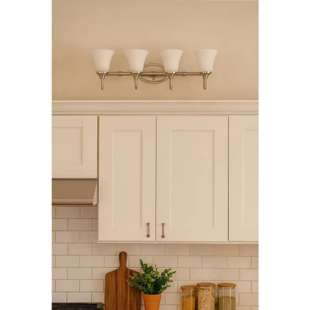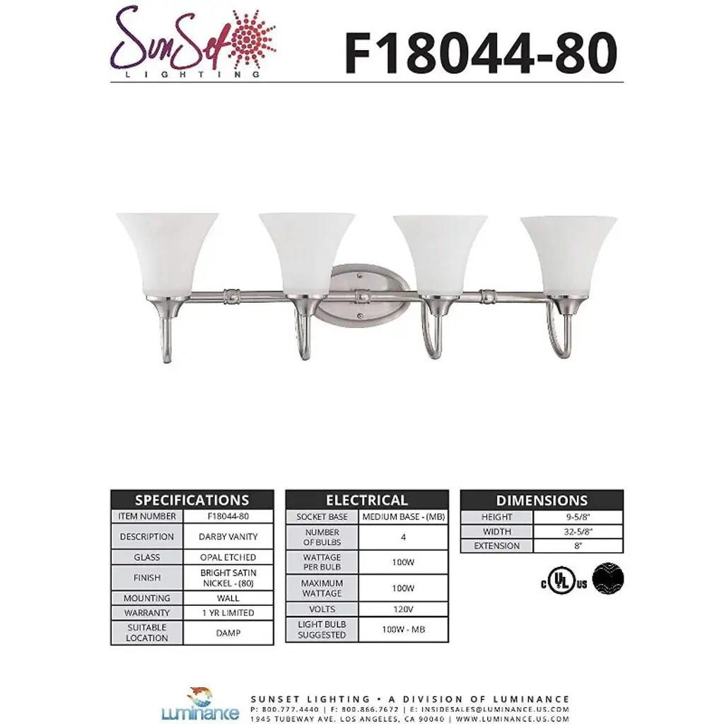 LUMINANCE F18044-80 Vanity Darby 4 Lights Bring even, flattering illumination to wider vanities with the Darby 4-light fixture. Its clean lines pair with opal etched glass shades to diffuse light softly for daily tasks. Designed for dependable performance, it uses four medium-base bulbs to deliver bright, balanced lighting. Key Features: • Four-light vanity ideal for larger sinks and mirrors • Opal etched glass shades for soft, glare-reduced lighting • Uses four 100W medium-base bulbs (not included) • Sized to fit above standard double vanities Specifications: • Type: Four Light Vanity • Dimensions: 32-5/8" W x 9-5/8" H x 8" E • Lamping: 4 × 100W MB (Medium Base) • Shade: Opal Etched Glass