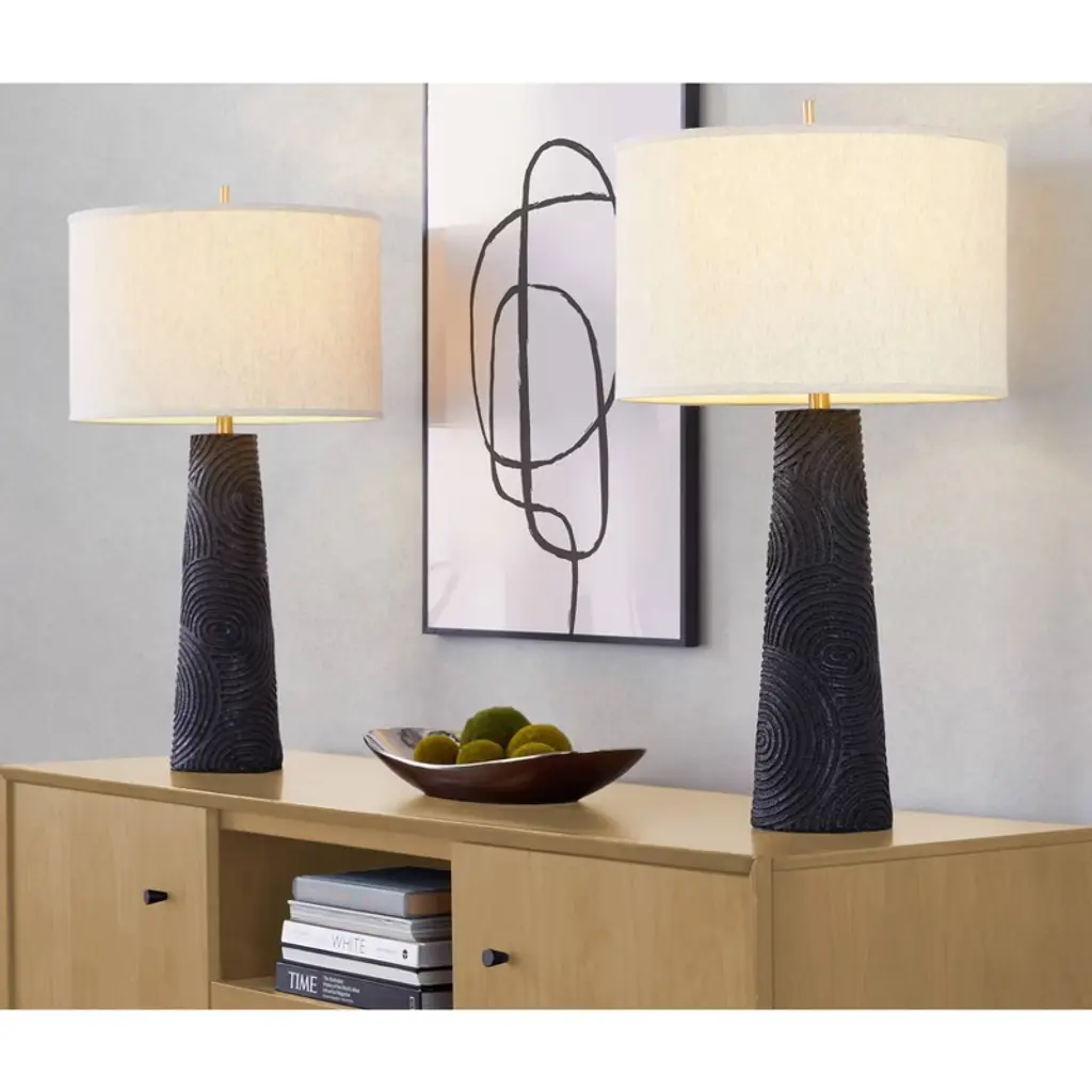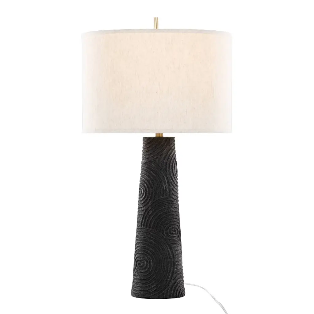 Elevate your space with the Kona Table Lamp from Grandview Gallery by LumiSource, the epitome of contemporary chic. This polyresin table lamp is accented with modern brass details, exuding an air of sophistication. Its intricately grooved base, harmonizes flawlessly with the natural linen drum shade, casting a warm, inviting glow. Elevate your space with impeccable style and craftsmanship.