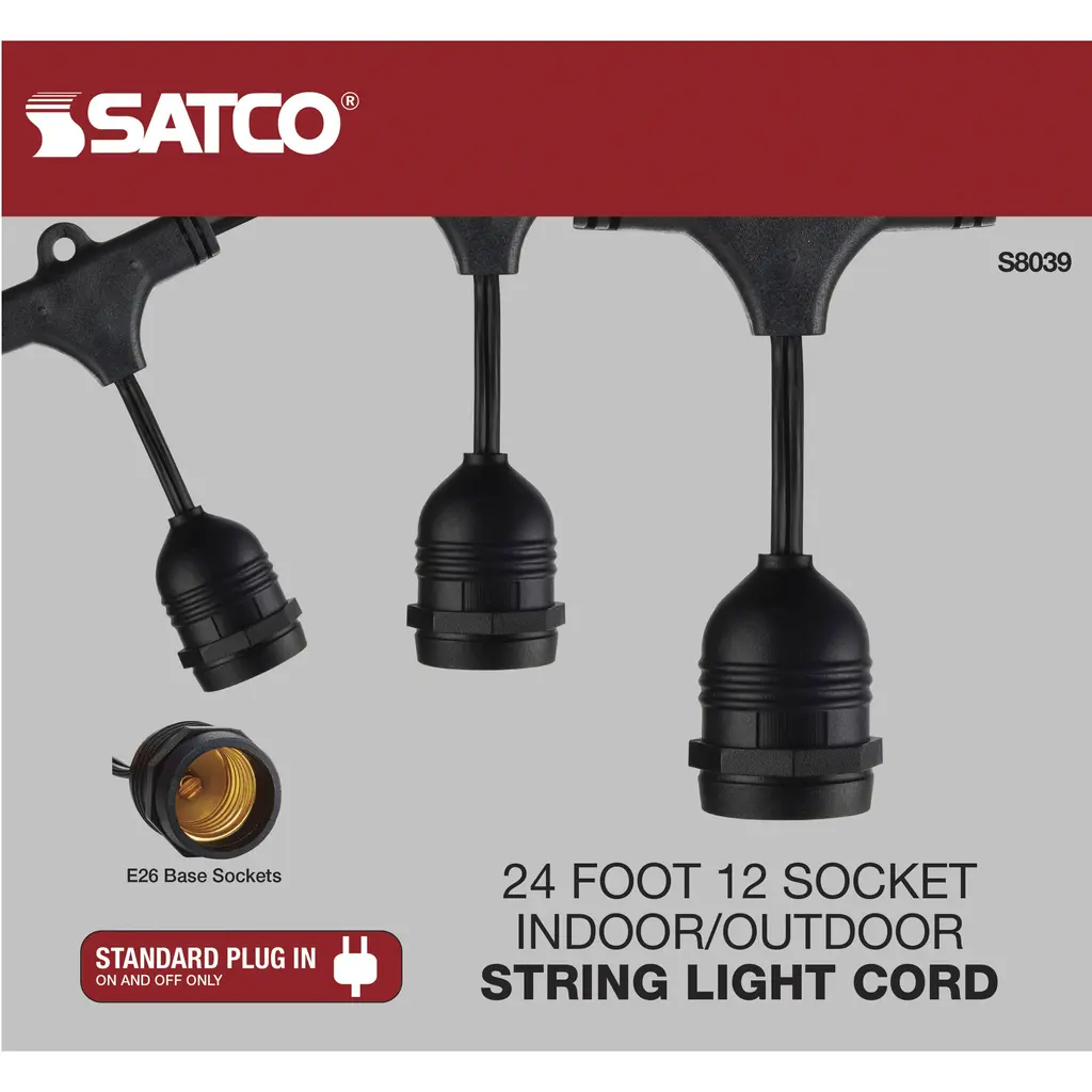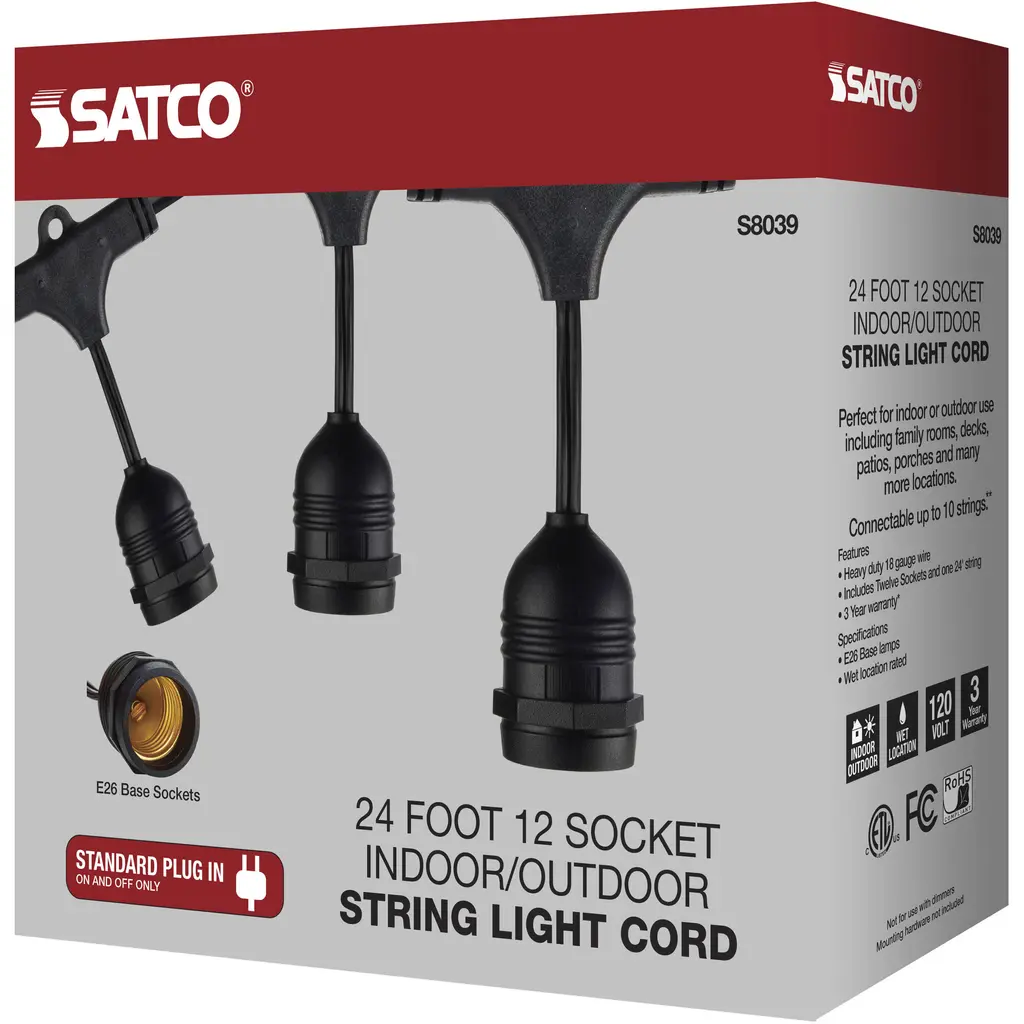 24Ft; LED String Light; 12 Socketed Black Cord and Plug Only