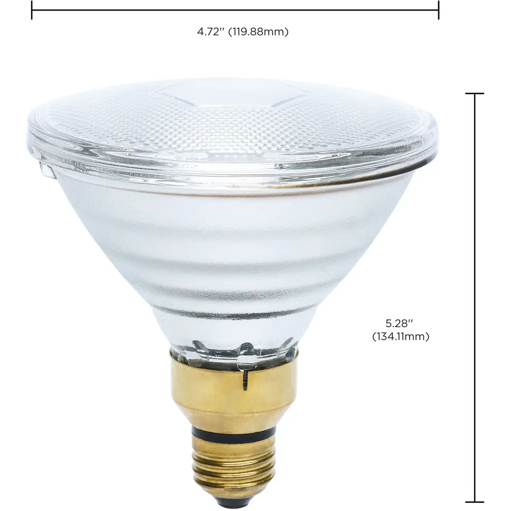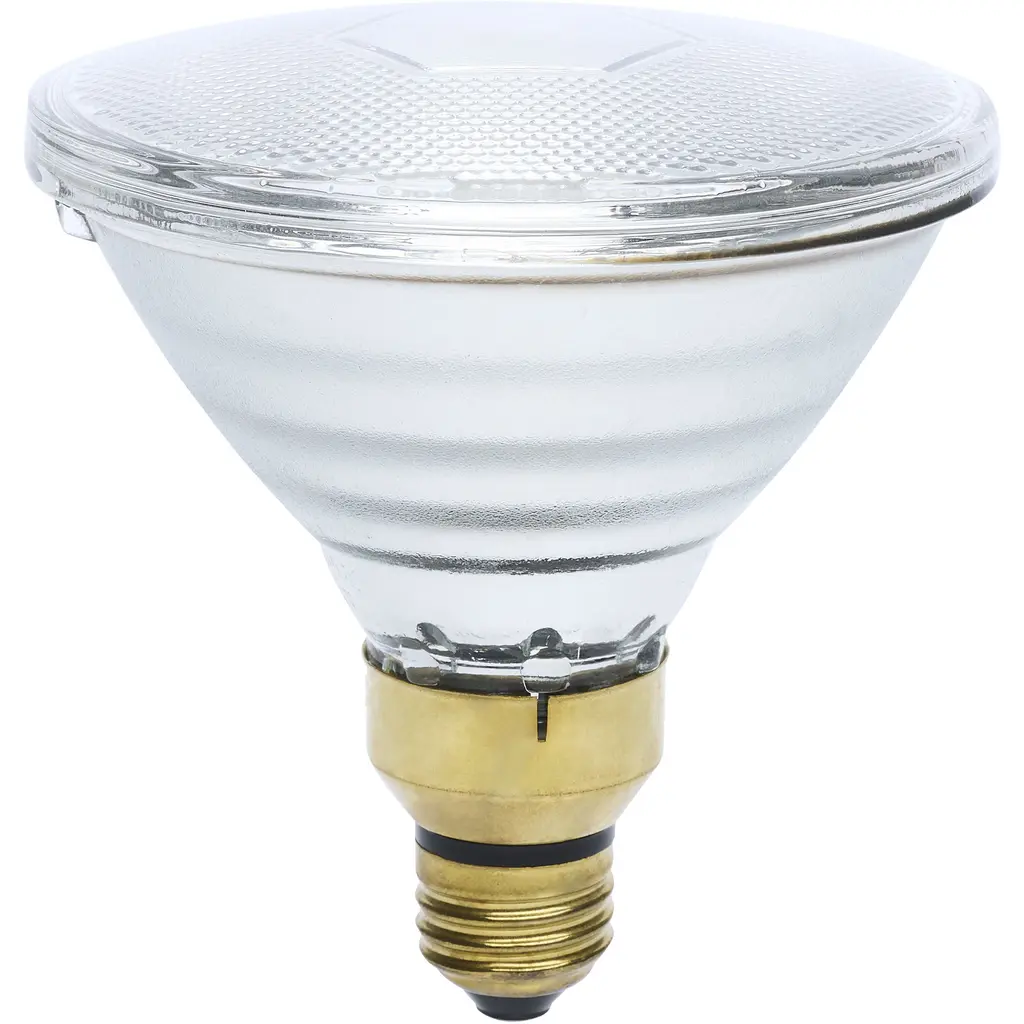 SATCO NUVO's S4798 incandescent heat lamp offers a reliable and versatile 125-watt heating solution, delivering focused warmth for various applications. Designed with a standard E26 medium base and operating at 120 volts, it emits a comforting glow ideal for maintaining heat. This PAR38-shaped bulb features a clear finish and weatherproof construction for enhanced safety and durability. Engineered to emit infrared radiation, it provides targeted heat, making it perfect for keeping poultry and piglets warm in brooders, maintaining food at serving temperatures, or adding comfort to bathrooms. With its practical design and dependable performance, this lamp is an excellent choice for agricultural, commercial, and residential use.