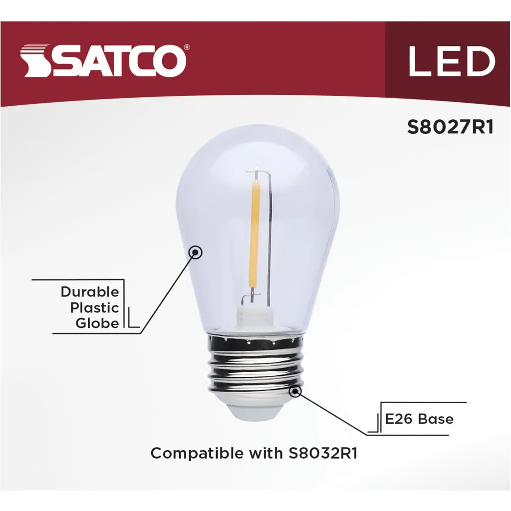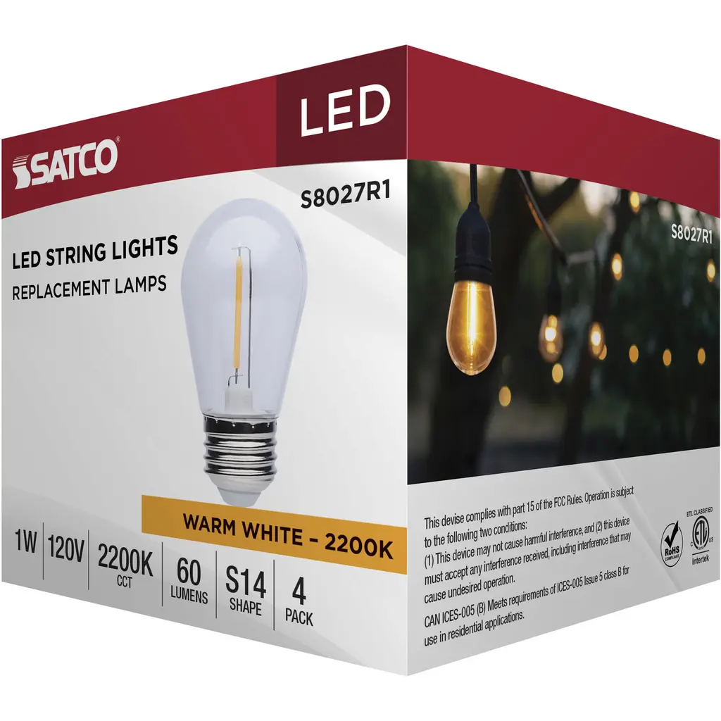 Illuminate your space with the SATCO'S S8027R1 S14 LED Replacement Lamps for SATCO String Light S8032R1 . This 4-pack features a warm white color temperature of 2200K, delivering 60 lumens with a clear Polycarbonate (PC) finish. Designed for medium base (E26) sockets, these non-dimmable, 1W lamps are rated for 30,000 hours and are suitable for wet locations. Enhance your outdoor ambiance with energy-efficient lighting that combines style and durability. Perfect for festive occasions or everyday use.