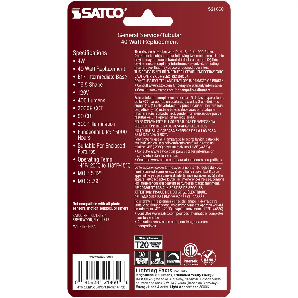 4-Watt T6.5 LED - Clear - Intermediate Base - 3000K - 400 Lumens - 120 Volts