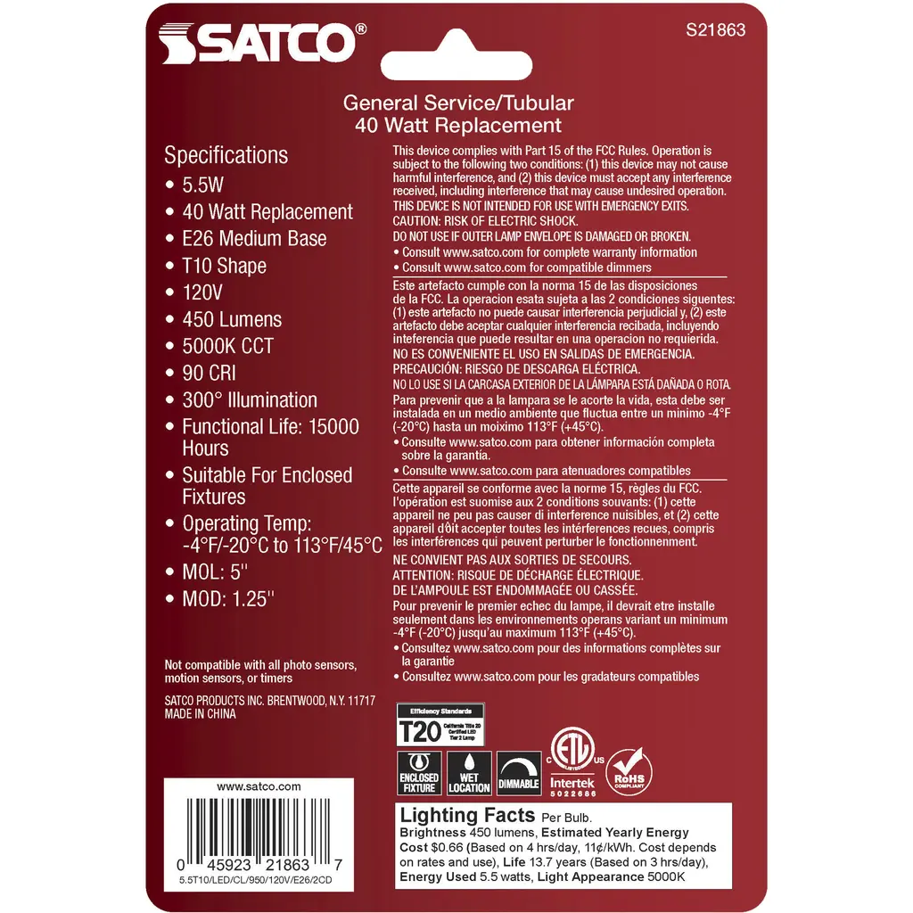 5.5-Watt T10 LED - Clear - Medium Base - 5000K - 450 Lumens - 120 Volts - 2-Pack