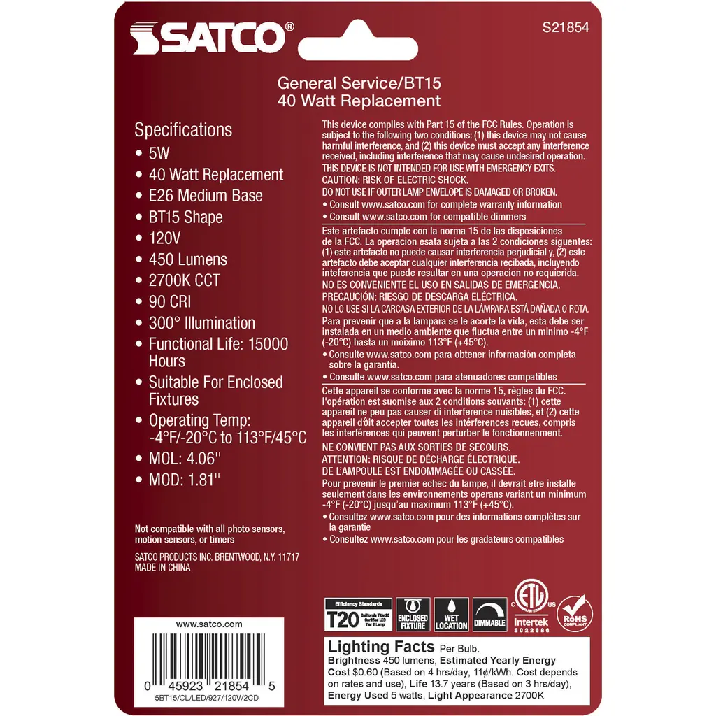 5-Watt BT15 LED - Clear - Medium Base - 2700K - 450 Lumens - 120 Volts - 2-Pack
