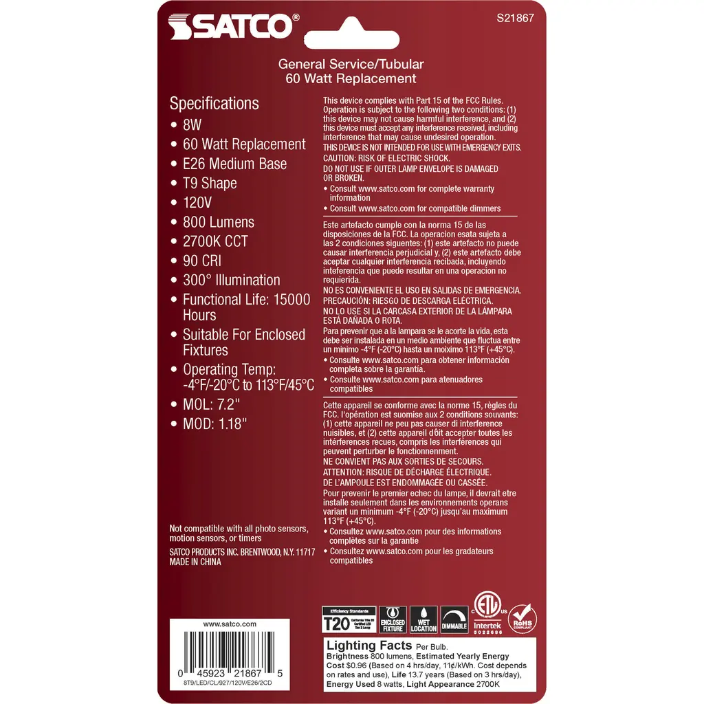 8-Watt T9 LED - Clear - Medium Base - 2700K - 800 Lumens - 120 Volts - 2-Pack