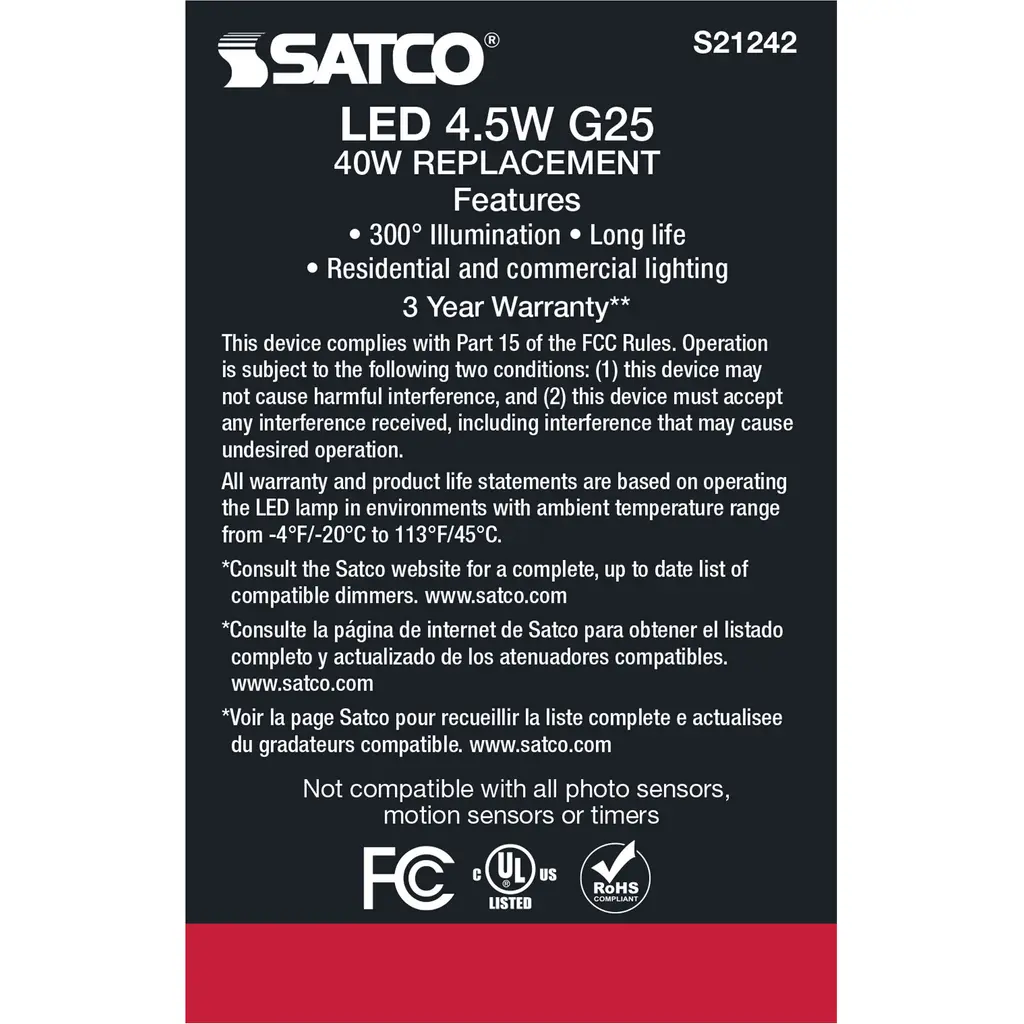 4.5 Watt G25 LED Lamp - Clear - Medium Base - 90 CRI - 2700K - 120 Volts - 2-Pack