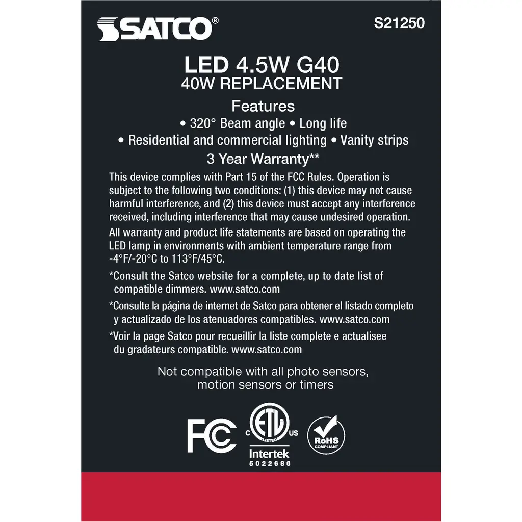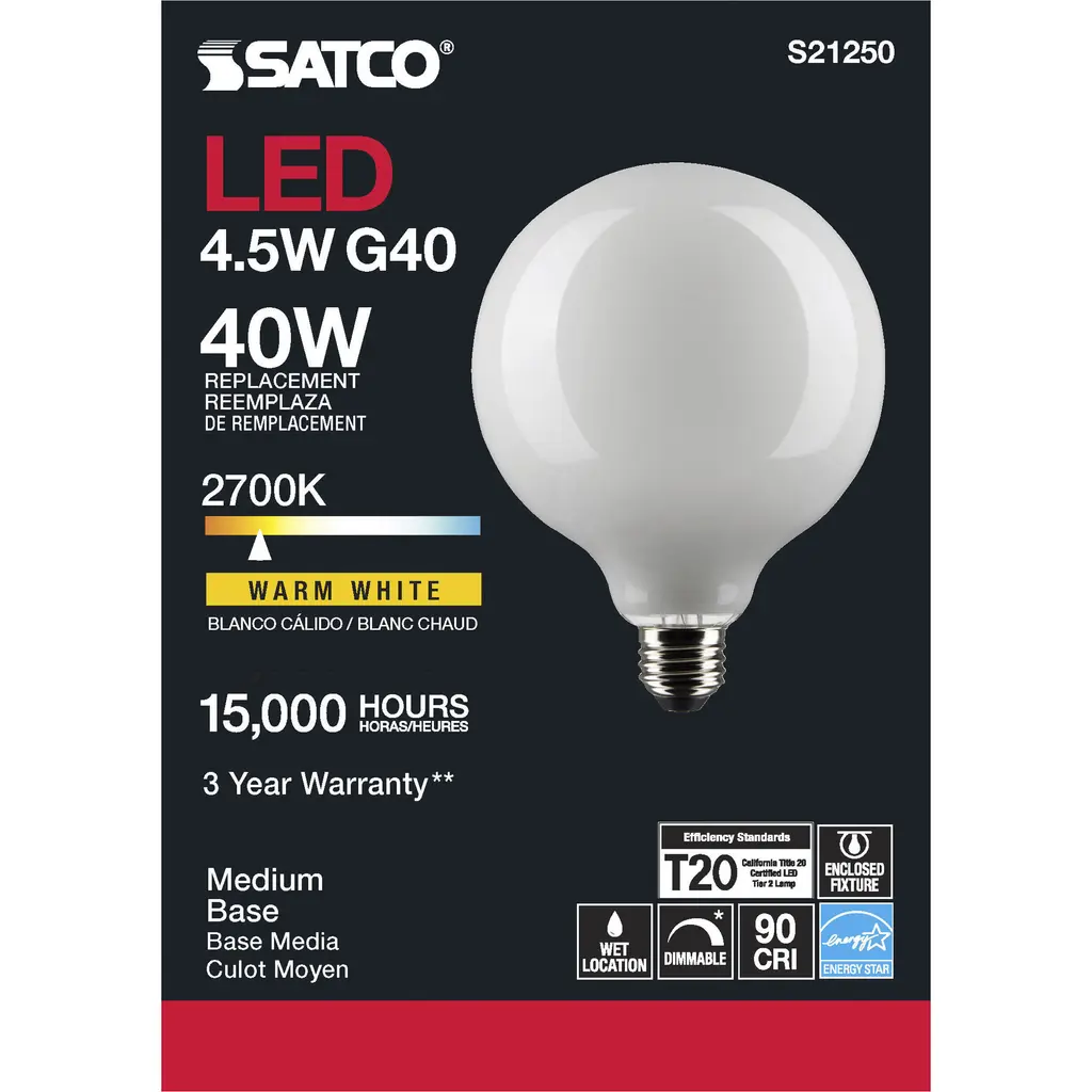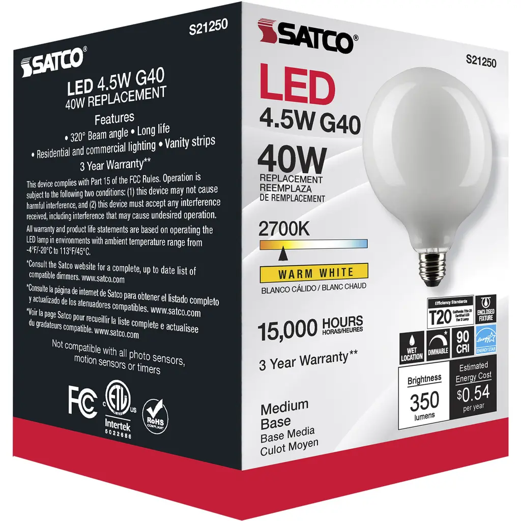 4.5 Watt G40 LED Lamp - White - Medium Base - 90 CRI - 2700K - 120 Volts