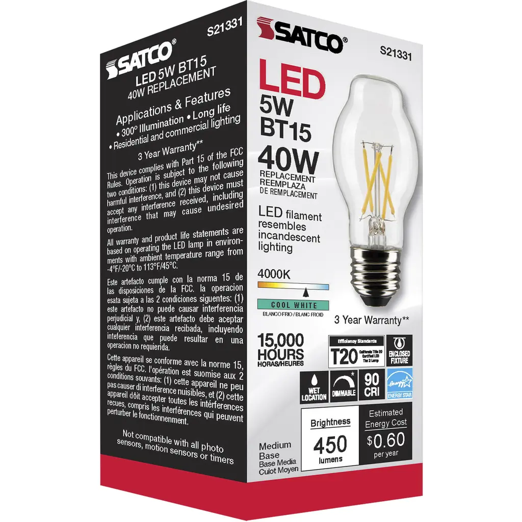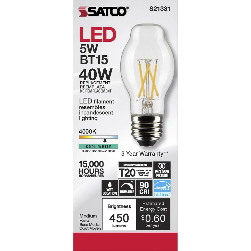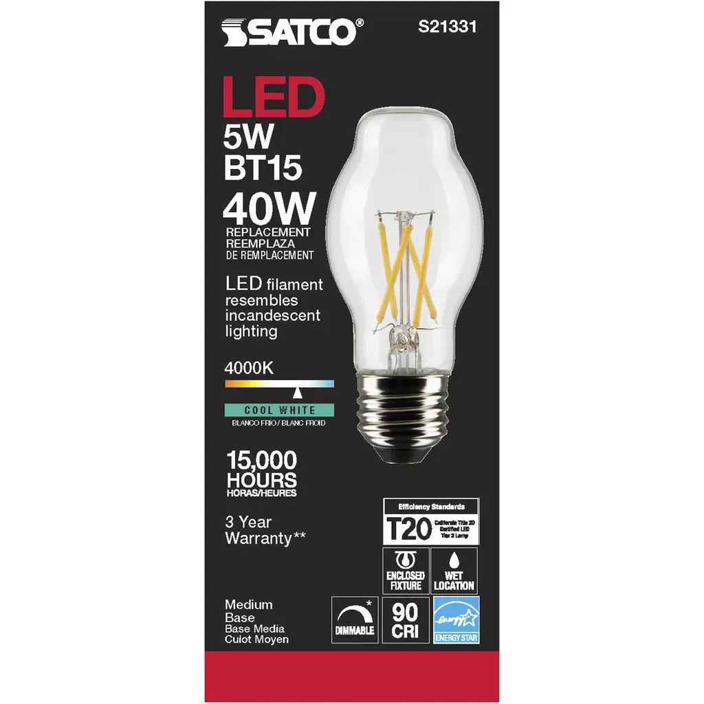 5 Watt BT15 LED Lamp - Clear - Medium Base - 90 CRI - 4000K - 120 Volts