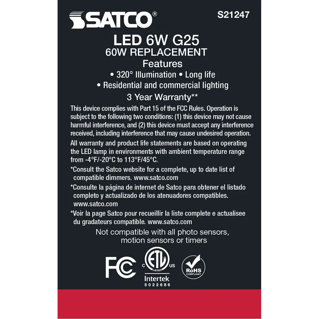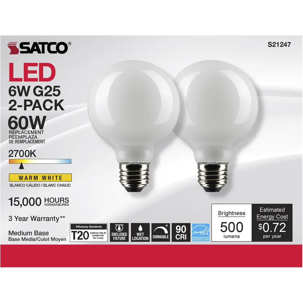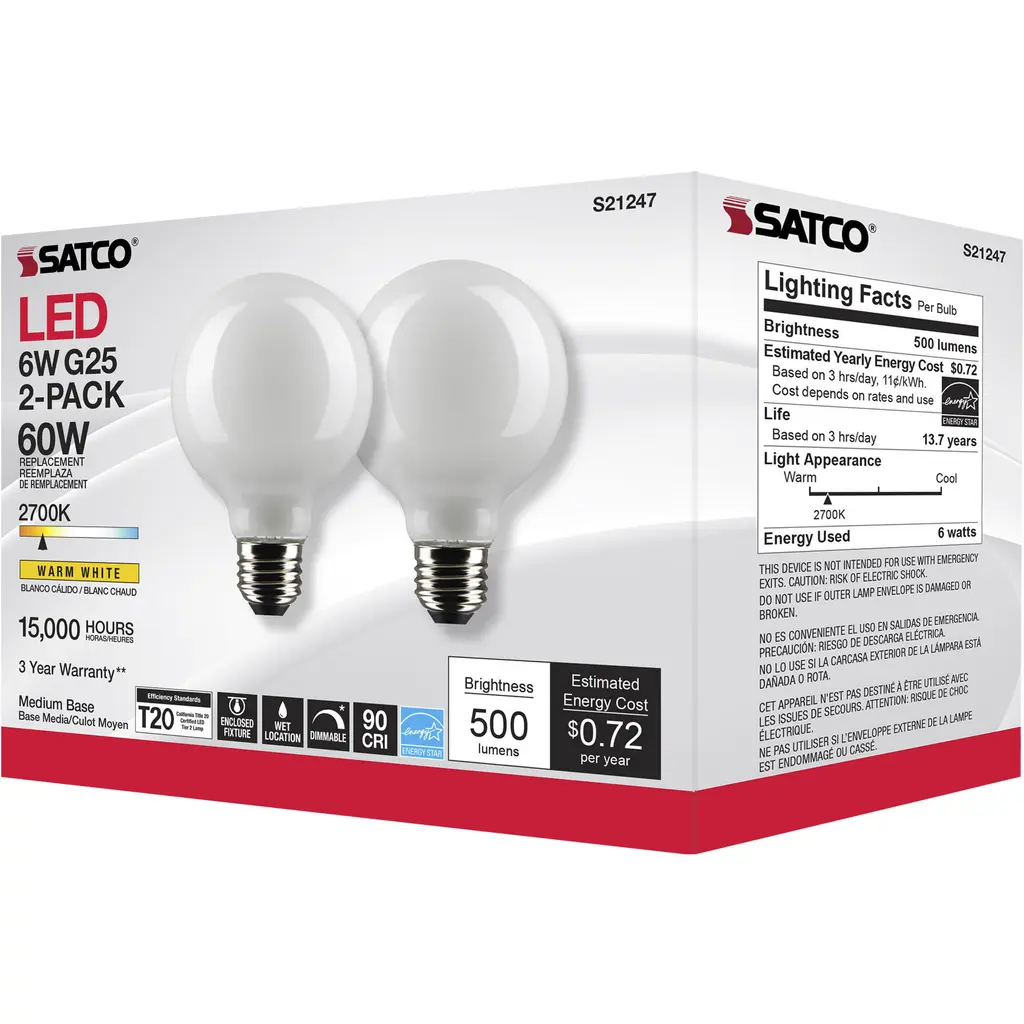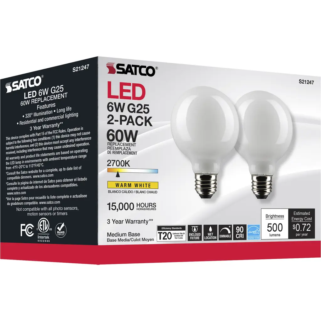 6 Watt G25 LED Lamp - White - Medium Base - 90 CRI - 2700K - 120 Volts - 2-Pack