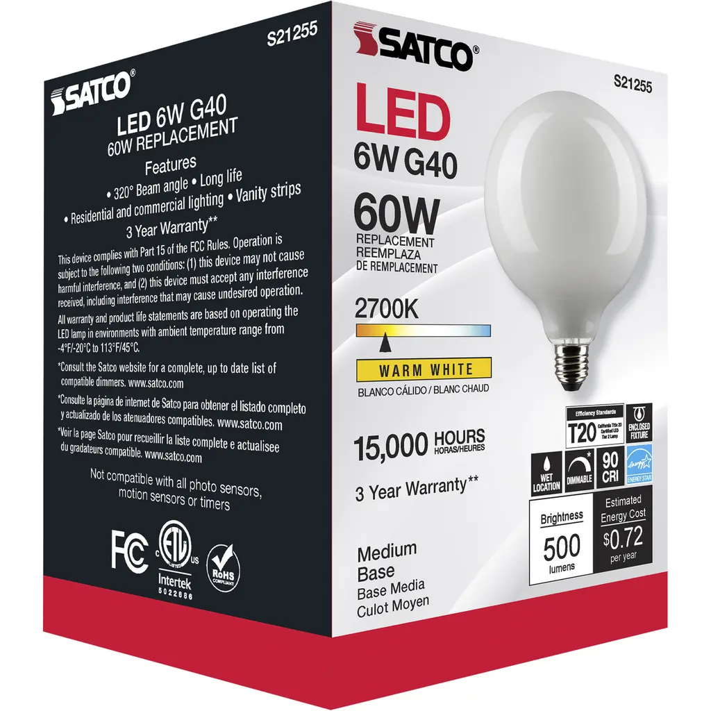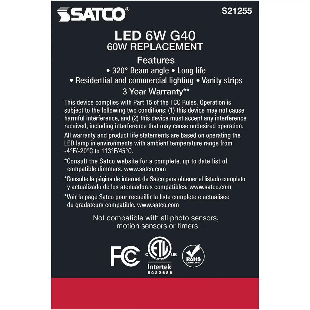 6 Watt G40 LED Lamp - White - Medium Base - 90 CRI - 2700K - 120 Volts