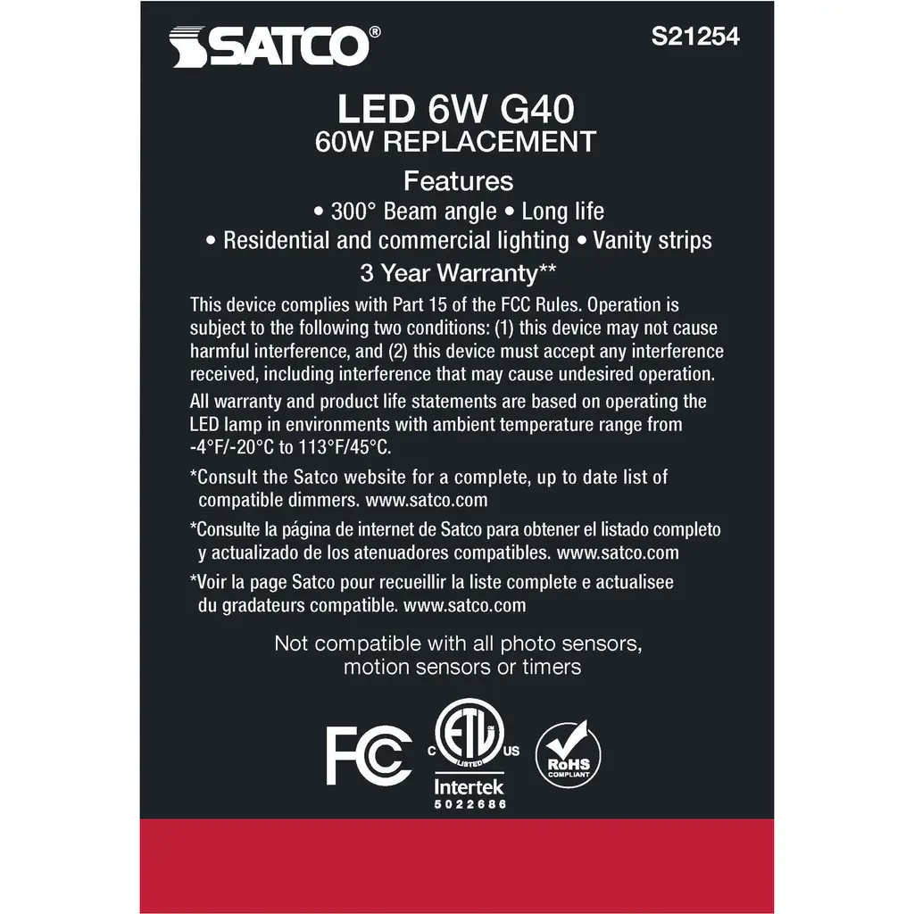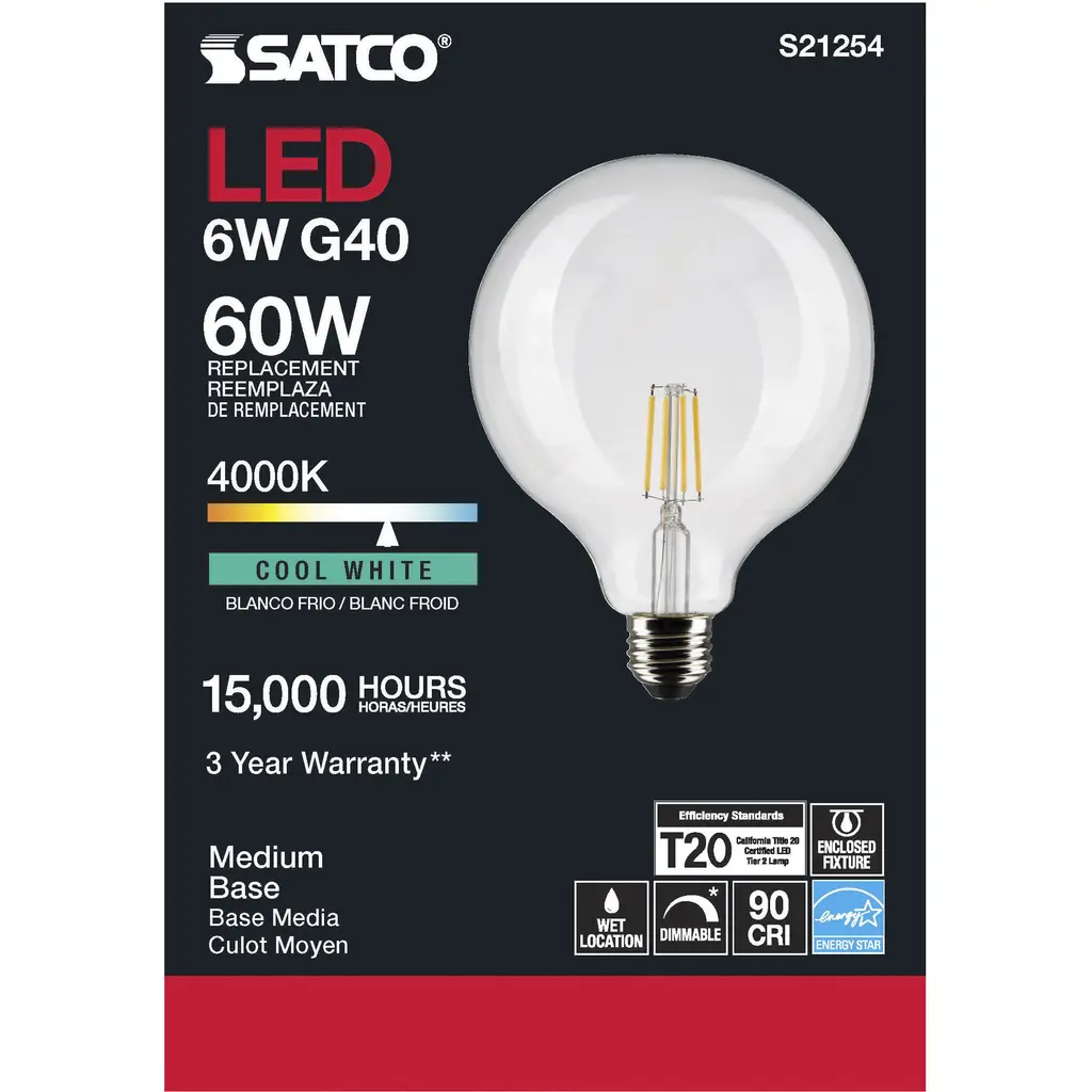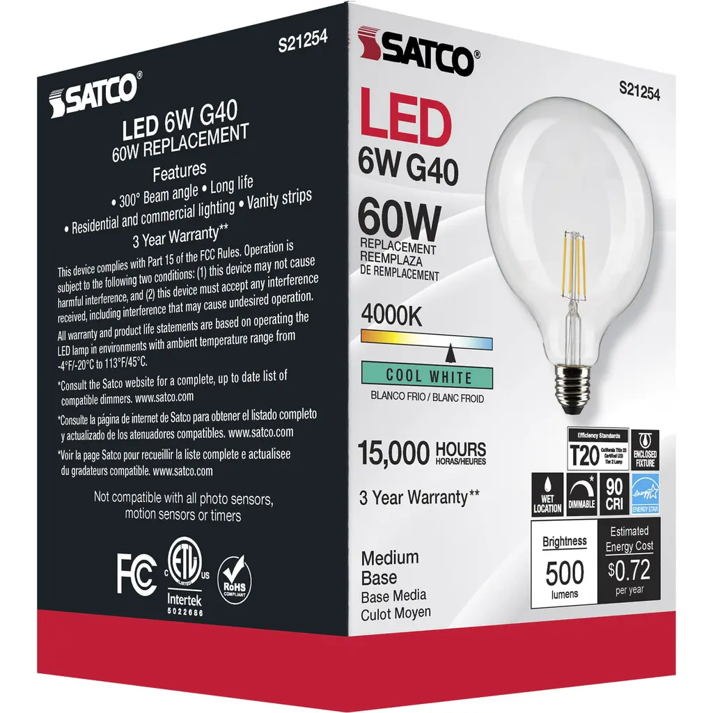 6 Watt G40 LED Lamp - Clear - Medium Base - 90 CRI - 4000K - 120 Volts
