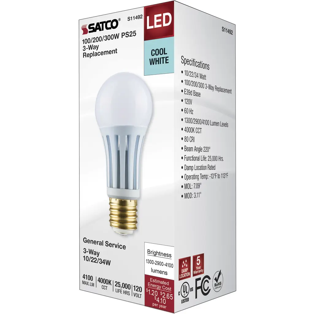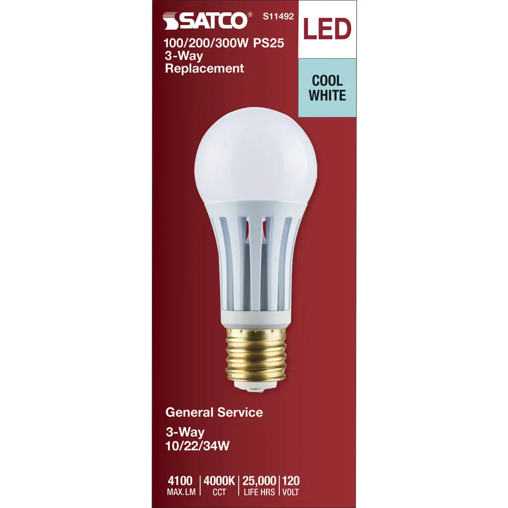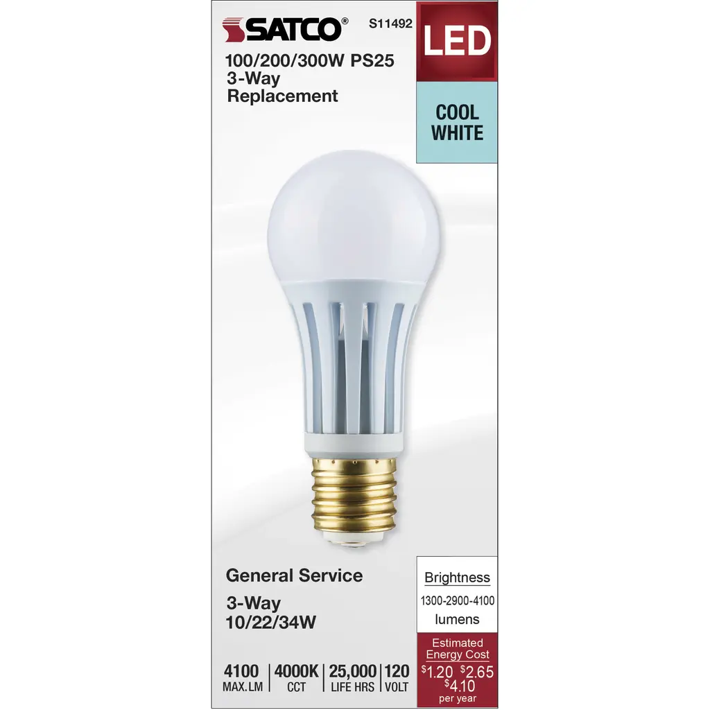 10/22/34 Watt PS25 LED Three-Way Lamp; E39d Mogul Base; 4000K; White Finish; 120 Volt