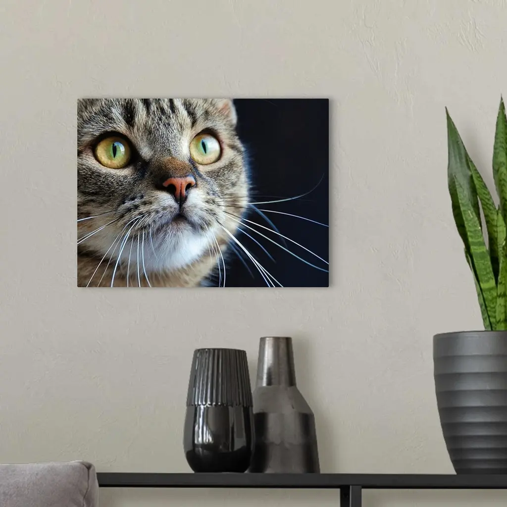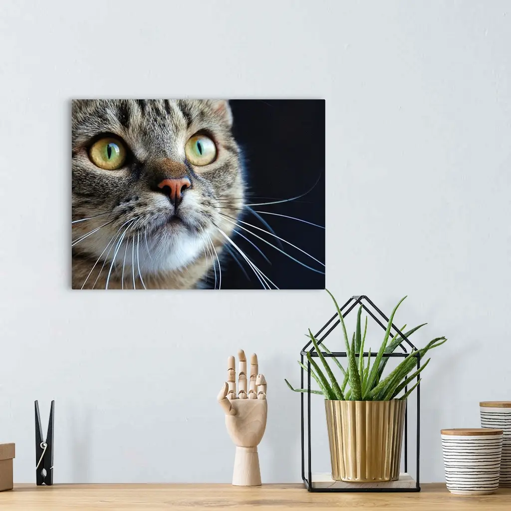 Close up of a tabby cat with long whiskers and green eyes.