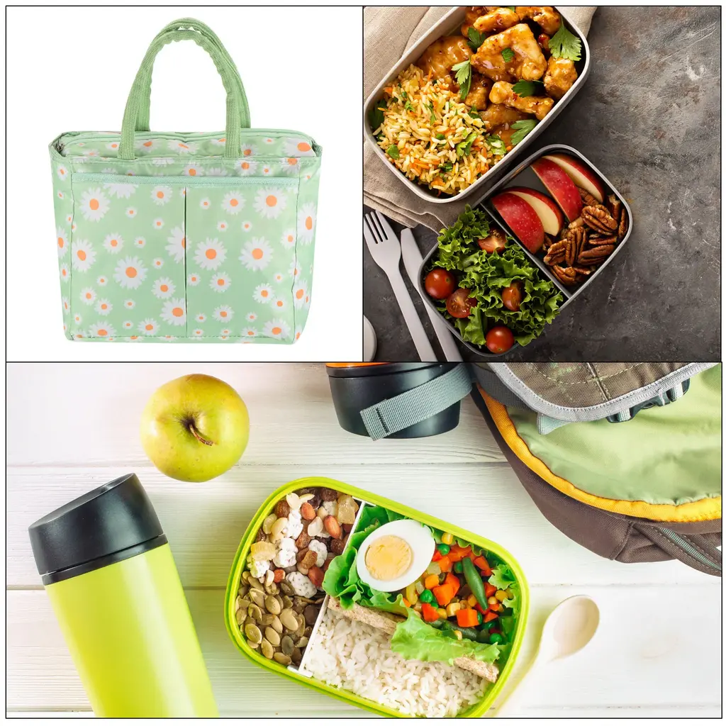 Our insulated lunch box can be used in offices, picnics, camping trips, travel, or any other outdoor activities. You can pack a variety of foods and drinks, including sandwiches, salads, fruits, and more. It is great for keeping your lunch fresh and delicious, no matter where you are.SpecificationColor: GreenMaterial: Oxford Cloth, Pearl Cotton, Insulation Aluminum FilmSize: 240 x 140 x 200mm / 9.4 x 5.5 x 7.9 inch(L*W*H)Packing List: 1 x Insulated Lunch BagAdvantageOur lunch box has a spacious design and provides enough space to fit all of your lunch items. It is made with advanced insulation technology, which keeps your food for hours. The handle design is for easy carrying. It is lightweight and foldable, without taking up too much space. It is made with quality materials that are sturdy, reusable, and easy to clean. InstructionPack your favorite foods and drinks into the lunch box and close the lunch box securely. Make sure all closures are properly fastened to prevent spills and leaks. When you are ready to eat, simply open the lunch box and enjoy your fresh and delicious meal.NOTE: After use, wipe down the lunch box with a damp cloth or sponge to clean off any spills or dirt. Let it air dry before storing it away.