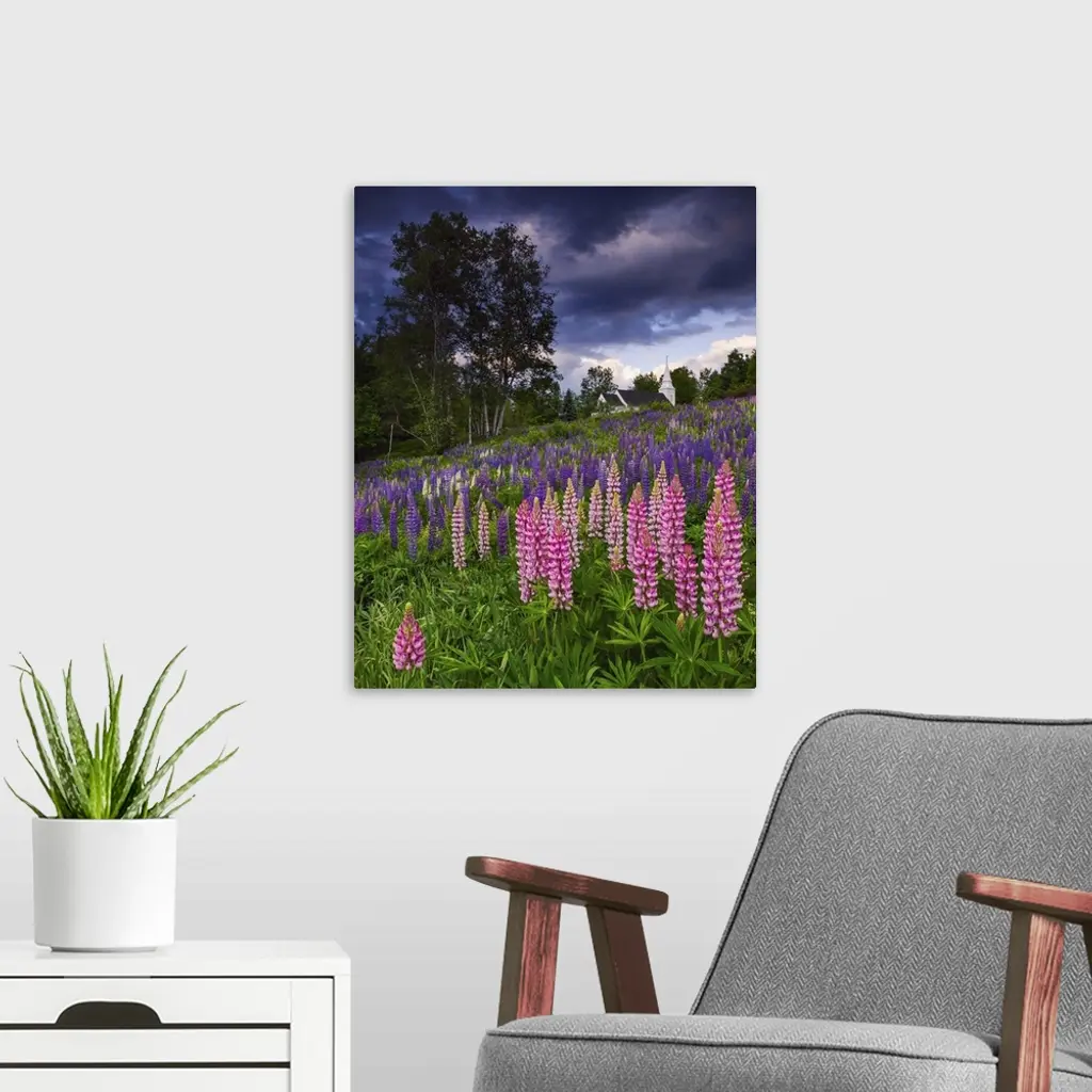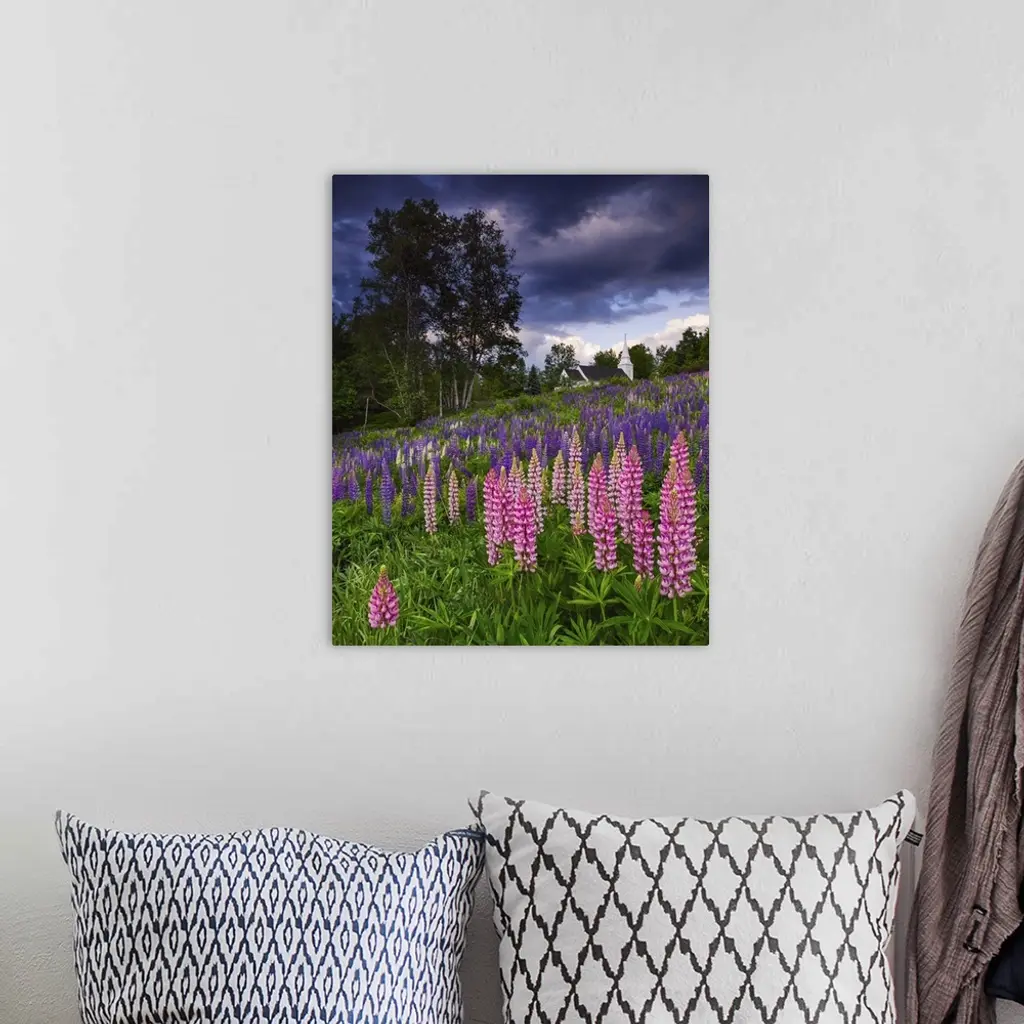 Photograph of pink and purple flowers on a hillside under dark aggressive clouds in the countryside.