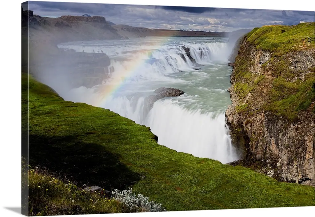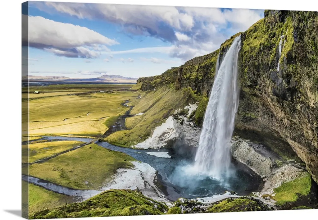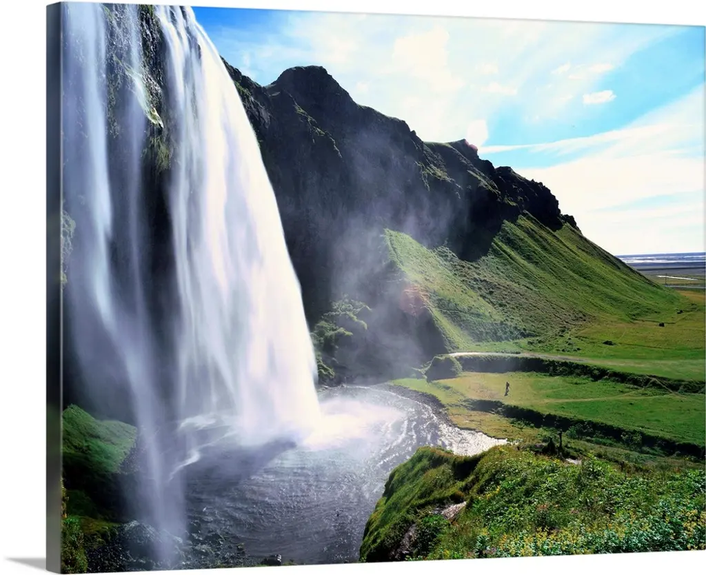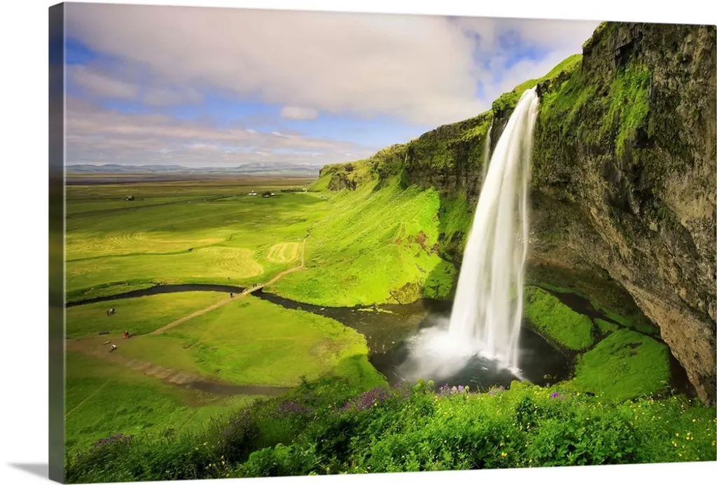 Lupins Wrap The Green Meadows Around The Skogafoss Waterfall, Sudurland, Iceland