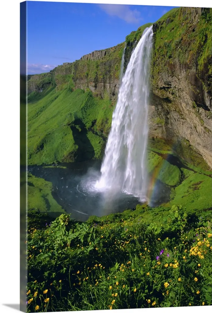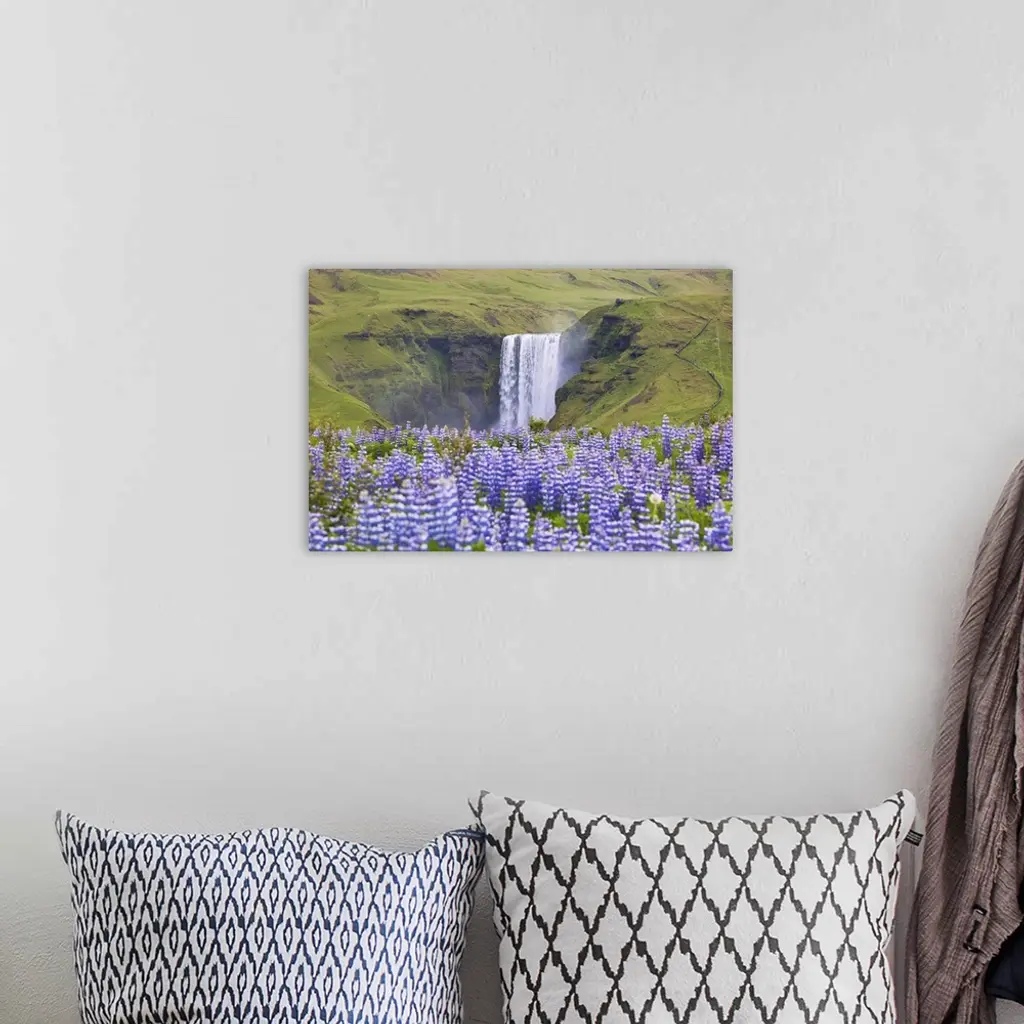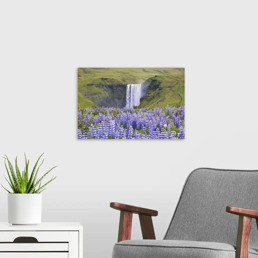 Lupins wrap the green meadows around the Skogafoss waterfall, Sudurland, Iceland