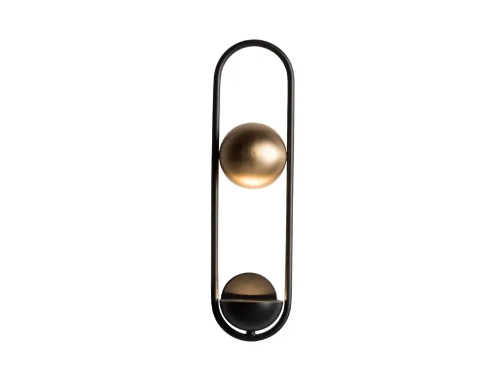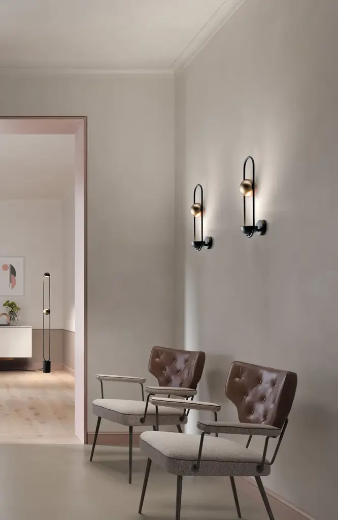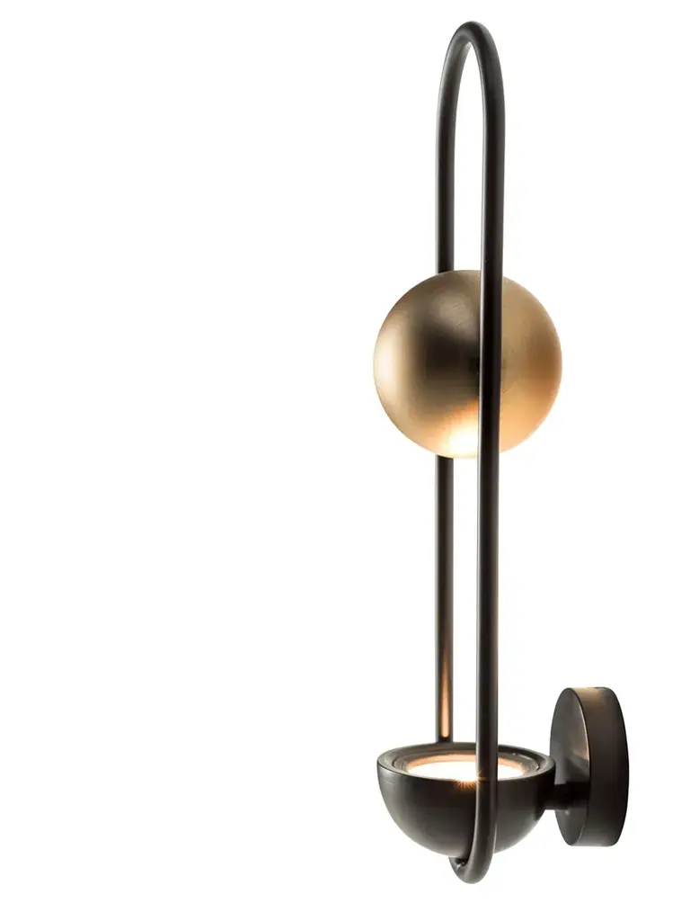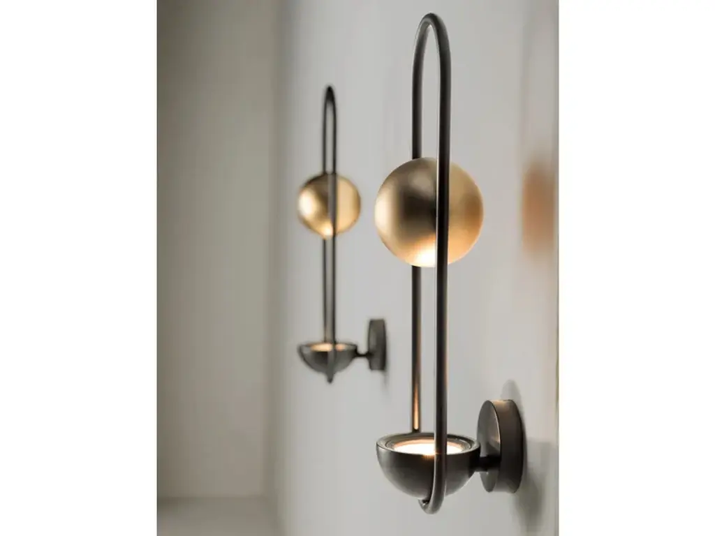 LUPPITER A1 SF is a wall lamp with a painted metal frame and metal shade. The sphere is available in metal or alabaster. LED lighting.8 W CRI>90 3000 K - 690 NOMINAL LM8 W CRI>90 2700 K - 635 NOMINAL LMDIMMABLE: TRIACCE LEDETL LED Extreme aesthetic cleanliness with chic details for the Luppiter family of suspension, wall, floor and table lamps, which Marco Zito designed inspired by the geometric shape of the ellipse, a recognisable and at the same time functional sign. The name Luppiter recalls a planet (Latin for 'father of Jupiter'), semantically associating the name of the family of lamps with the orbital shape of the structure that characterises it. The choice of materials, the precious decorative details in different colours and finishes, consolidate Masiero's identity and recognisability in the knowledge of metalworking. The ellipsoidal structure in matt black metal, the leit motif of the entire collection, integrates a small metal cap, placed on one of the frame's vertices (upper or lower depending on the model) and containing the LED light source. The orbit of the frame is enriched, depending on the type, by white alabaster or gold metal spheres, or by shiny decorative bell-shaped caps in gold-plated and brushed metal (with a white interior), which create a pleasant contrast with the stem with its essential lines. In detail, the suspensions are available with a frame in three heights and a small or large bell; the wall lamp, the floor lamp and the table version are characterised by an alabaster or metal sphere, the floor lamp and the table version are also available with a small bell cap. Thanks to the variety of shapes and finishes, Luppiter is a collection suitable for both residential decoration and use in contract settings, from hospitality to public spaces.