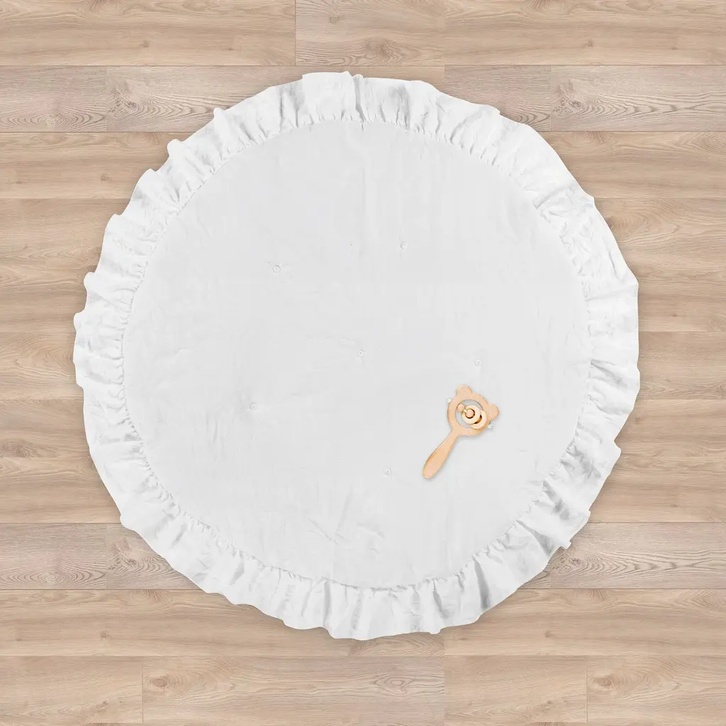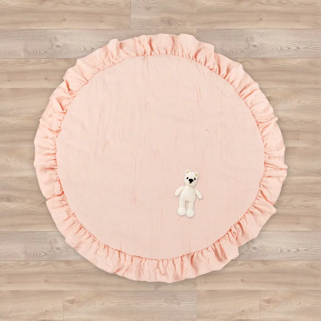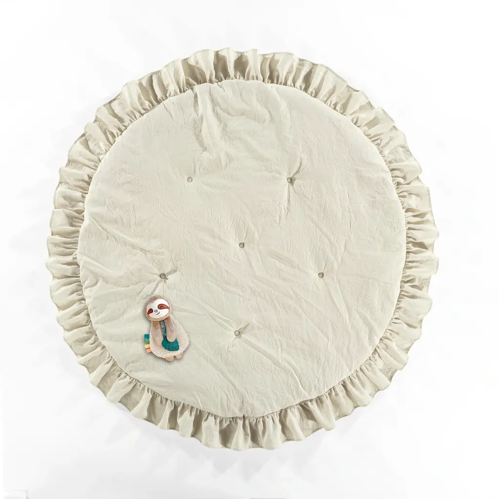 This generously sized STANDARD 100 by OEKO-TEX® certified super-soft round mat is the perfect spot for your little one to crawl around and play on safely. The ruffle detail brings a charming touch that will fit right into your stylish nursery decor.Bring this playful addition to your nursery for added design and a safe play area for your bundle of joy. This round play mat is a lovely, incredibly soft place for you and your baby to be able to enjoy play time. It is embellished with a graceful ruffle around the edge. This round mat has a 36 inch diameter. This play mat is STANDARD 100 by OEKO-TEX® certified, which means the fabric, dye and all components have been tested in an independent laboratory and certified against a list of more than 350 harmful substances. Easy-care fabric makes upkeep of this play mat a breeze. Please refer to label for full care instructions.Features: