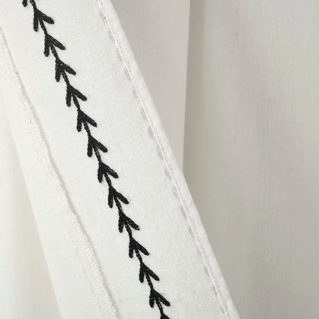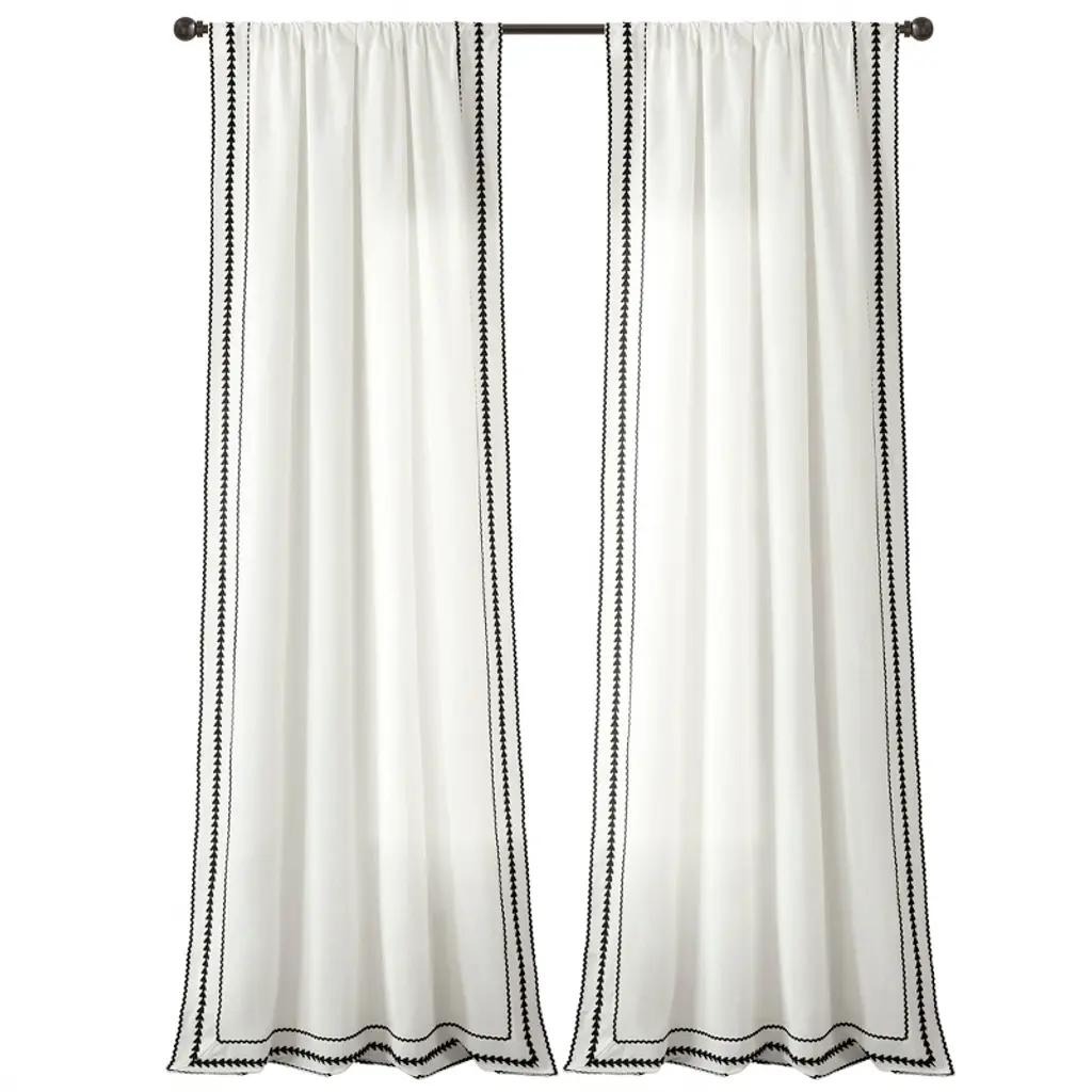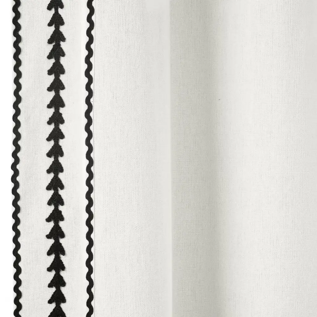 Delicately adorned with intricate ric rac embroidery, this panel adds a touch of charm and elegance to any space. Let natural light filter through while enjoying a unique blend of classic and contemporary style in this curtain panel. Keep your style simple and textured with this embroidered curtain panel. With an elegant touch from the detailed border, this window curtain can be styled in any space to accent your welcoming look. Sold as a single panel, this curtain has a 42 inch width. Please refer to label for full care instructions.