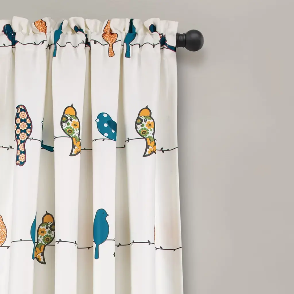 Celebrate your fun side with our Rowley Birds Light Filtering Window Curtain Panels. This eclectic design has rows of colorful birds perched on a wire. Each bird features a whimsical or floral pattern, sure to add playful charm to your window decor. The multicolored design on a white background makes it easy to style with your existing decor. These fun bird print light filtering panels will provide privacy while helping to filter sunlight and regulate the temperature in the room. Each panel measures 52 inches wide and is sold as 2 window panels. Decorate your bedroom, living or dining room windows with this unique floral bird printed curtain set. The whimsical design is easily styled into farmhouse, coastal, or boho decor themes. This curtain offers seamless installation with its 3" rod pocket, allowing you to easily slide it onto your curtain rod, or by using clip rings (not included). This curtain set is safe to machine wash on the gentle cycle and to tumble dry on low. Please refer to the care label for best results before cleaning.