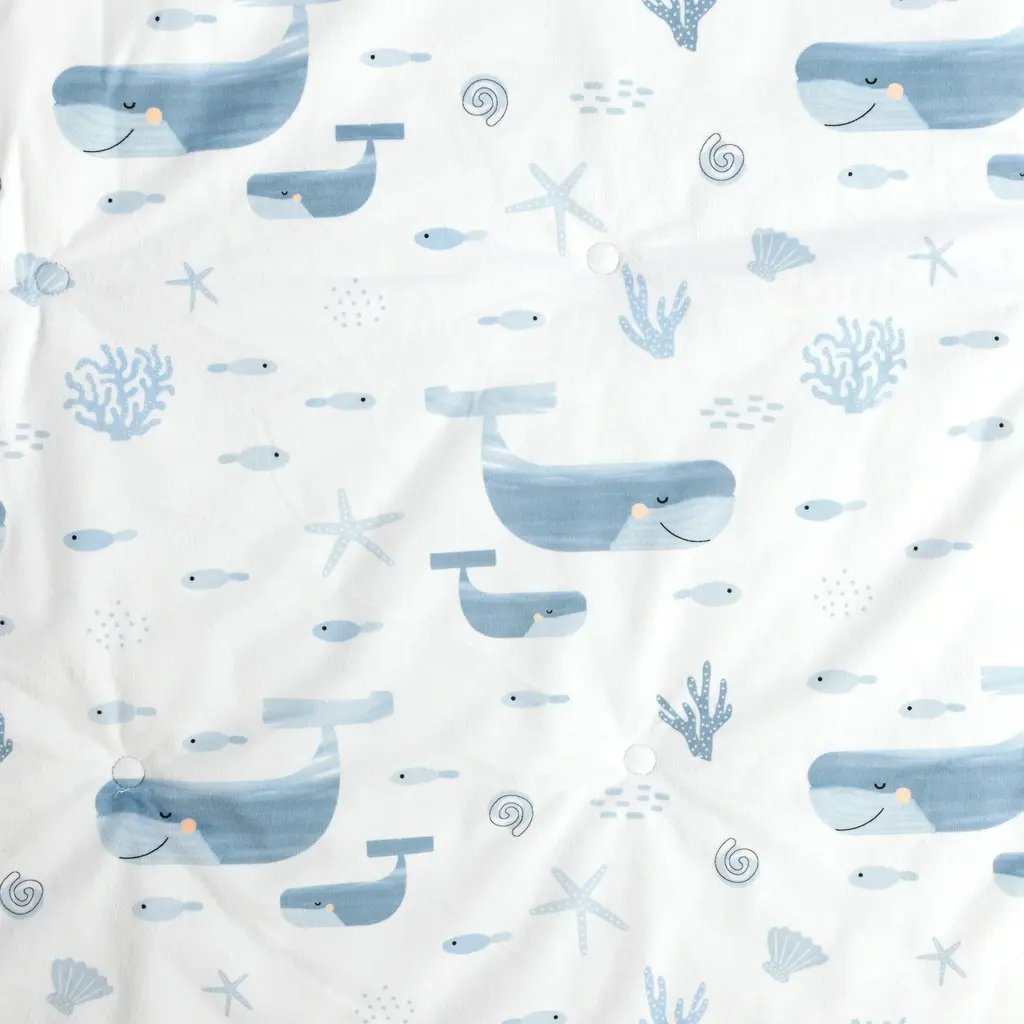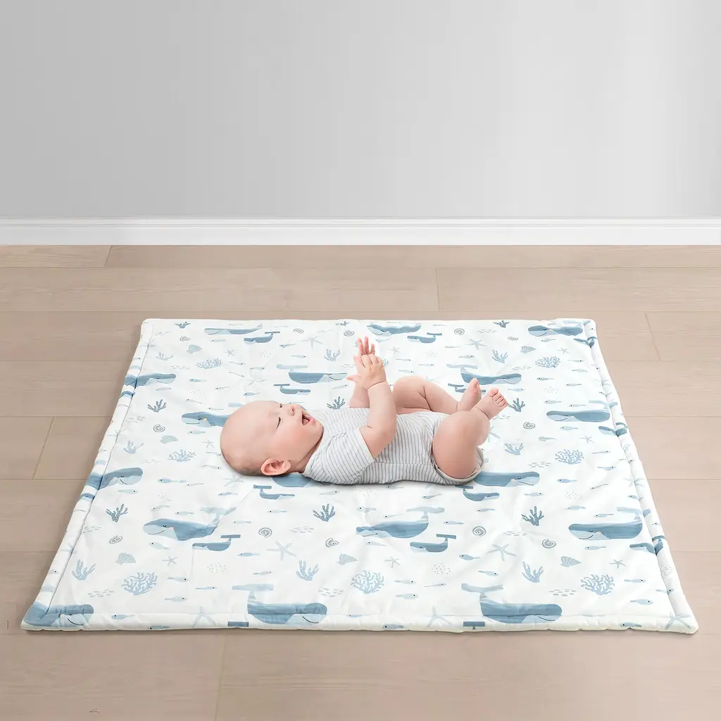 This seaside play mat is the perfect addition to your underwater themed nursery. Decorated with whales, fish and coral this STANDARD 100 by OEKO-TEX certified play mat will give you and your baby or toddler hours of endless fun and exploring.The perfect addition to your oceanic nursery! This seaside play mat is soft and durable with a cute, whale and coral design. This play mat is perfect for keeping your little one safe and comfortable while they explore and play. Soft and plush for their comfort, this 35 inch square play mat has a lightweight polyester filling. A one inch border styles the edges of the mat and the reverse is solid white. This play mat is STANDARD 100 by OEKO-TEX certified, which means the fabric, dye and all components have been tested in an independent laboratory and certified against a list of more than 350 harmful substances.Feature: