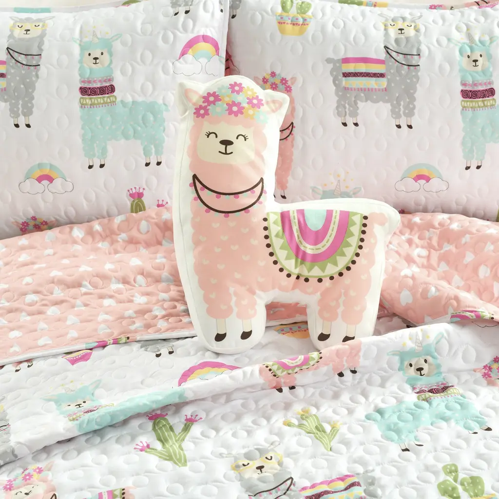 Your children will simply adore this stylish reversible quilt set which comes complete with a llama-shaped decorative pillow. The boho look of this design will brighten any child’s bedroom.When redecorating a child’s bedroom, you want a set that can grow with the child. This set is made to last through many washes and features a design that is versatile enough to be used for younger and older children and tweens. The llamas, cacti and rainbows combined in this print create the perfect look for your kid’s bedroom. When you’re ready to change it up, simply flip the quilt and shams over to the other side for a whole new look. The reverse side is a much more subtle pattern of small hearts against a solid color background.Features: