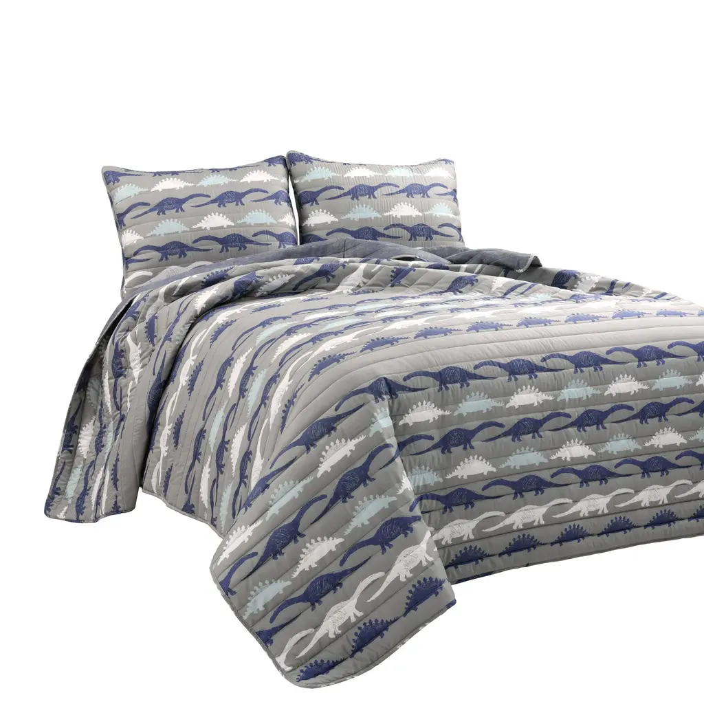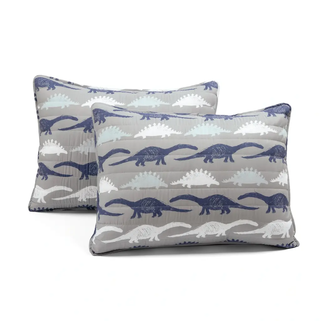 Bring a prehistoric theme into your child's bedroom with this dinosaur printed quilt set. This 2-piece reversible bedding set includes the quilt and matching pillow sham.Introduce a fun theme into your child's bedroom with this dinosaur print bedding set. The reversible quilt and sham are shaded with a solid color on the reverse side giving you two looks in one. The parade of dinosaurs is perfect for a friendly prehistoric theme that sparks creativity and let's the imagination run wild! This quilt set includes one quilt and one matching sham. This product is STANDARD 100 by OEKO-TEX® certified, which means the fabric, dye and all components have been tested in an independent laboratory and certified against a list of more than 350 harmful substances. Please refer to label for full care instructions. Twin 2 Piece Set:Full/Queen 3 Piece Set: