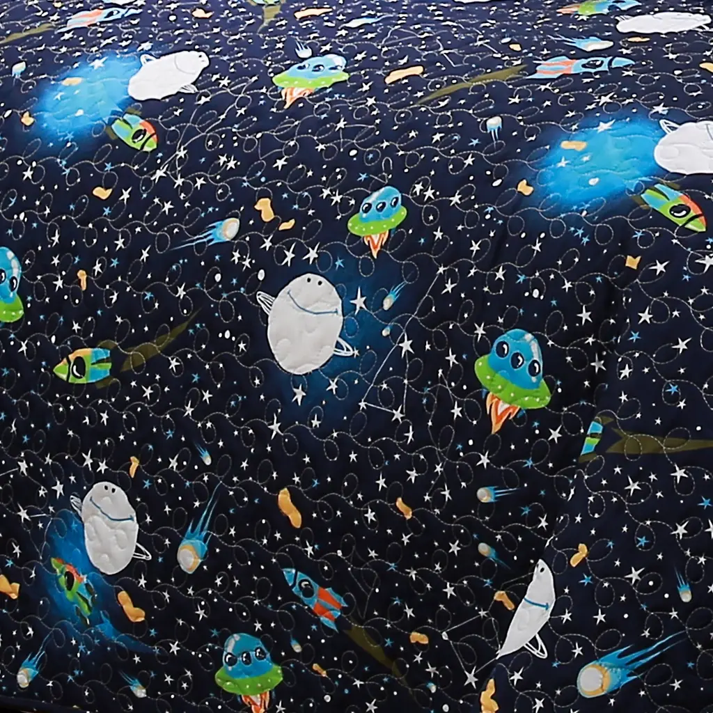 If your child enjoys gazing at the stars & planets, this quilt set is the perfect option for his or her big kid bedroom. The cosmic patterns on both the front and reverse give you two options for the room and help bring your child's imagination to life.Full/Queen is a 5-pc set includes: Twin is a 4-pc set includes:
