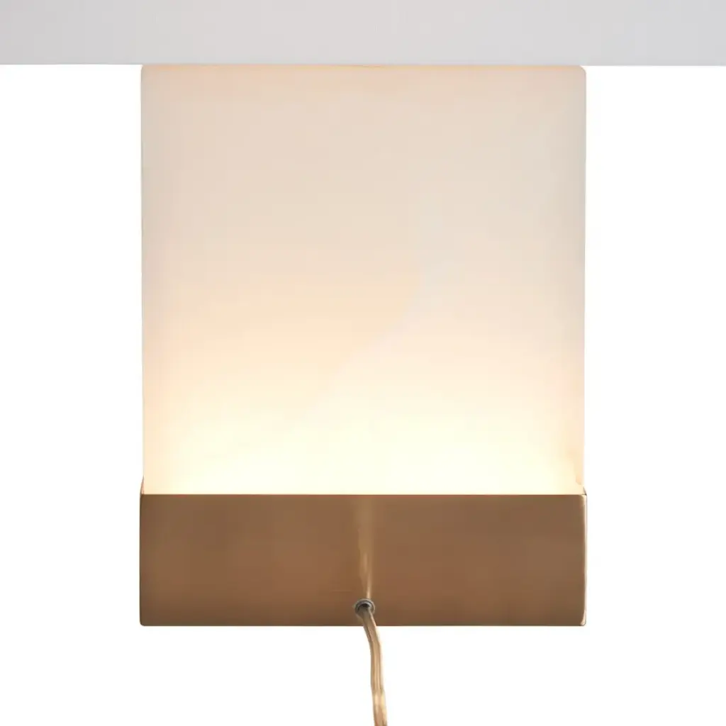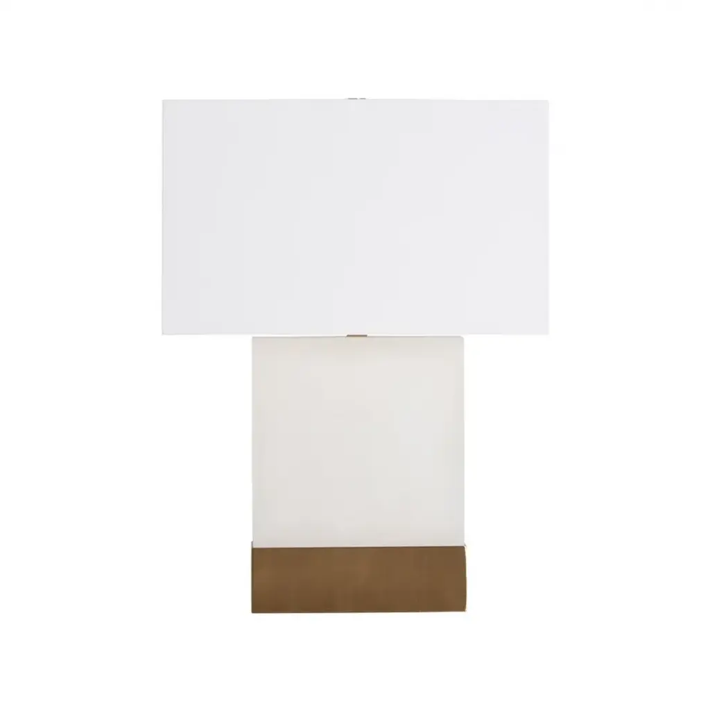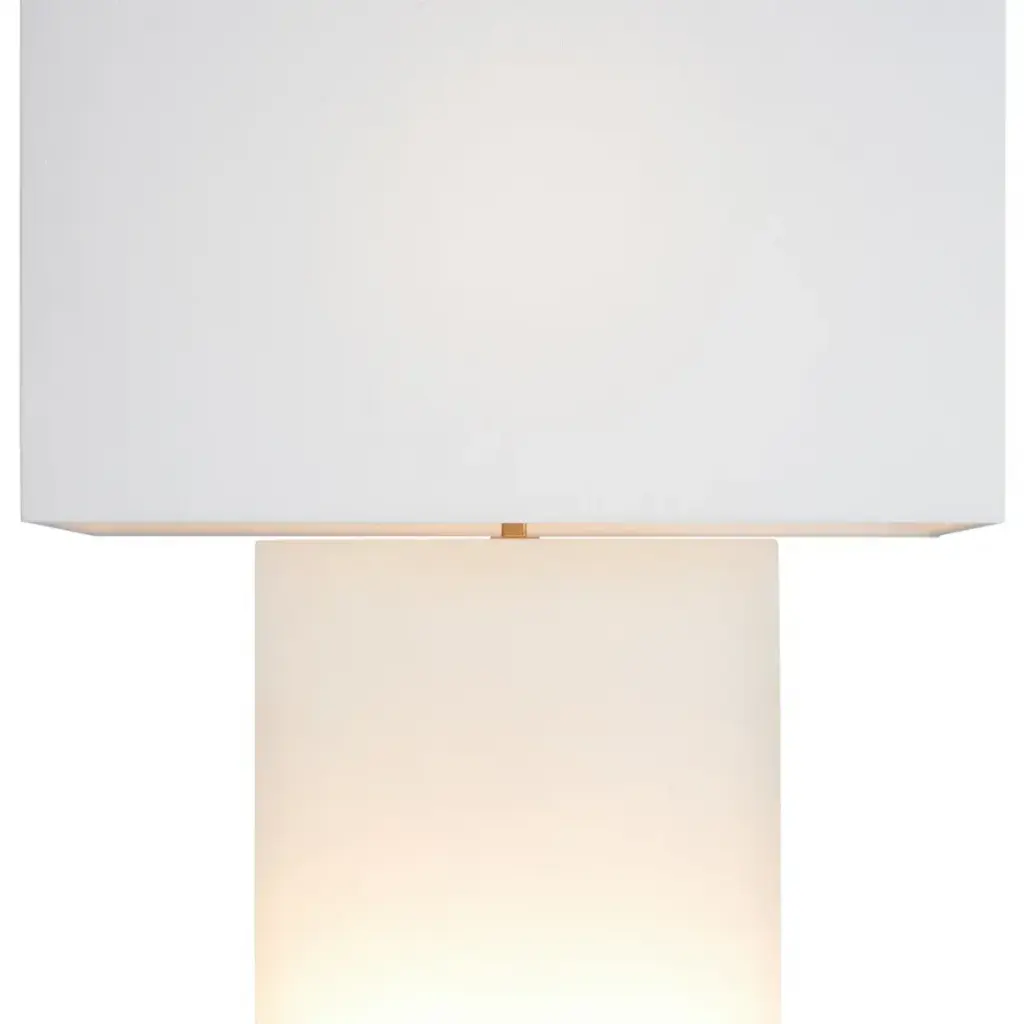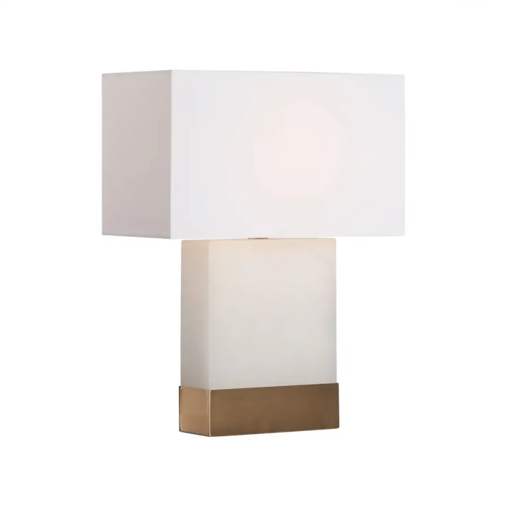 This alabaster lamp glows warmly from within, highlighting its natural and soft texture. A sleek brass band around the base adds a refined, modern touch.
