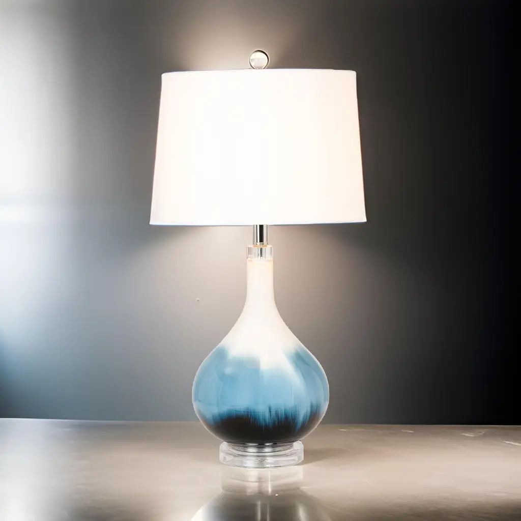 Introducing the 28-Inch Blue Tone Glass Table Lamp, a striking lighting masterpiece that effortlessly combines artistry and function. This lamp is designed to illuminate your space with elegance and style while serving as a captivating focal point. The lamp's base is a work of art, crafted from exquisite blue tone glass that adds a touch of sophistication to any room. Standing at 28 inches tall, it makes a bold yet graceful statement. The blue tones evoke a sense of calm and serenity, making it a versatile addition to a variety of decor styles. Topping this artistic creation is a linen hardback shade, which adds a layer of timeless charm to the lamp. Its clean lines and neutral tones not only diffuse the light softly for a warm and inviting ambiance but also complement the lamp's overall design. Equipped with a 3-way switch, this lamp provides customizable lighting options to suit your mood and needs. Whether you seek soft, ambient lighting for relaxation or brighter illumination for tasks and activities, this lamp can effortlessly accommodate your preferences. This 28-Inch Blue Tone Glass Table Lamp is more than just a source of light; it's a work of art that elevates your decor. Whether placed in your living room, bedroom, or any space in need of a stylish accent, it promises to enhance your surroundings with its exquisite design and versatile functionality. Illuminate your space with sophistication and grace using this exceptional lamp.