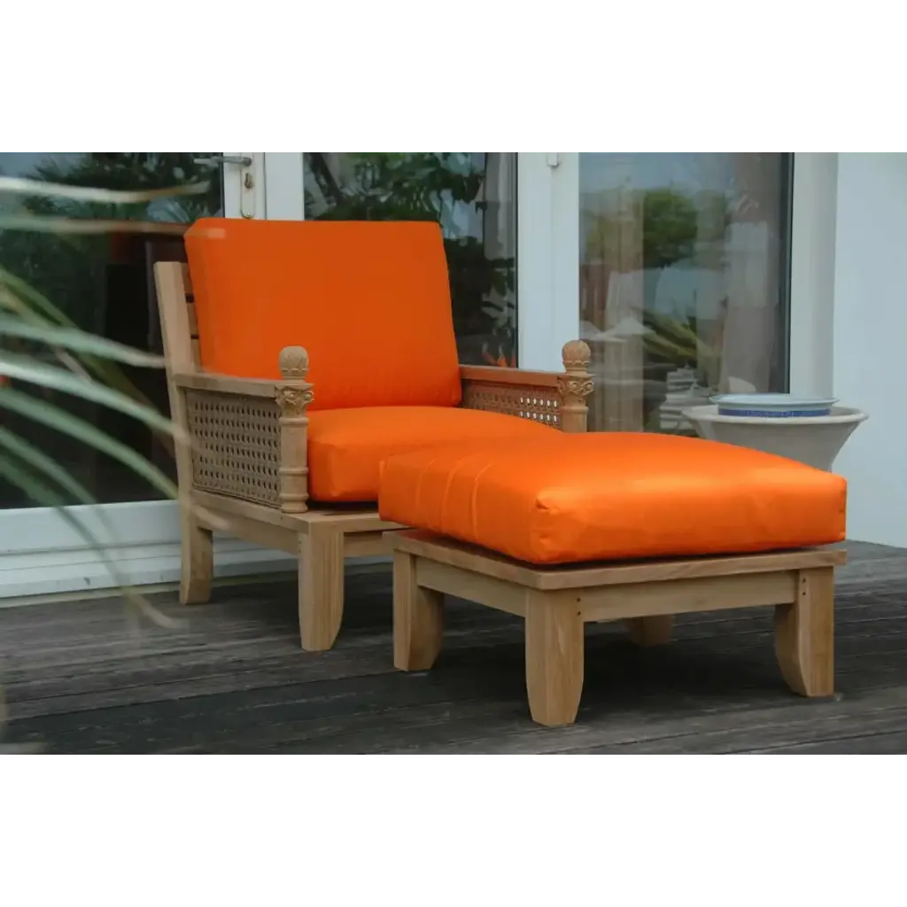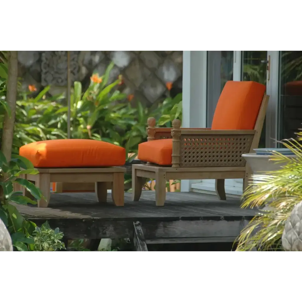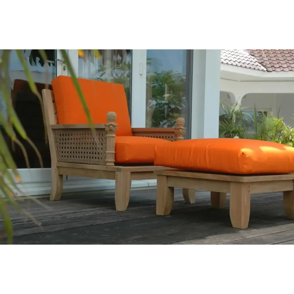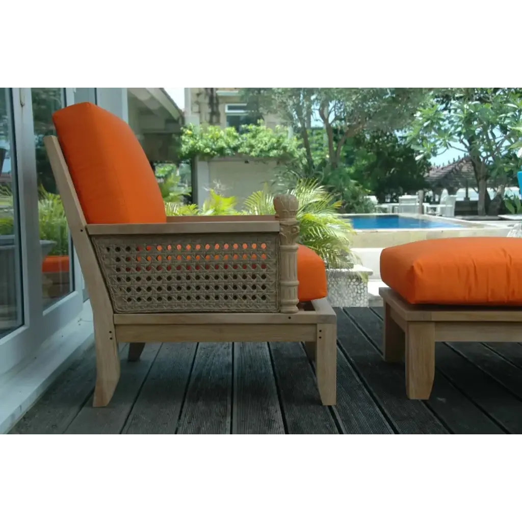 The Luxe Deep Seating Armchair together with the Luxe Ottoman comfortably indulges whoever sits in its presence. The armchair style provides regal elegance, comfort and uniqueness for your backyard area, featuring one of a kind finial artichoke expertly handcrafted by a professional carpenter, and wicker webbing for the armchair’s sides. Yet its foundation is built with quality made from premium grade teak wood that’s unfinished and sanded smooth for a natural smooth finish. Set also includes 6” thick seating cushions from All-Weather Sunbrella fabrics with color and pattern option.