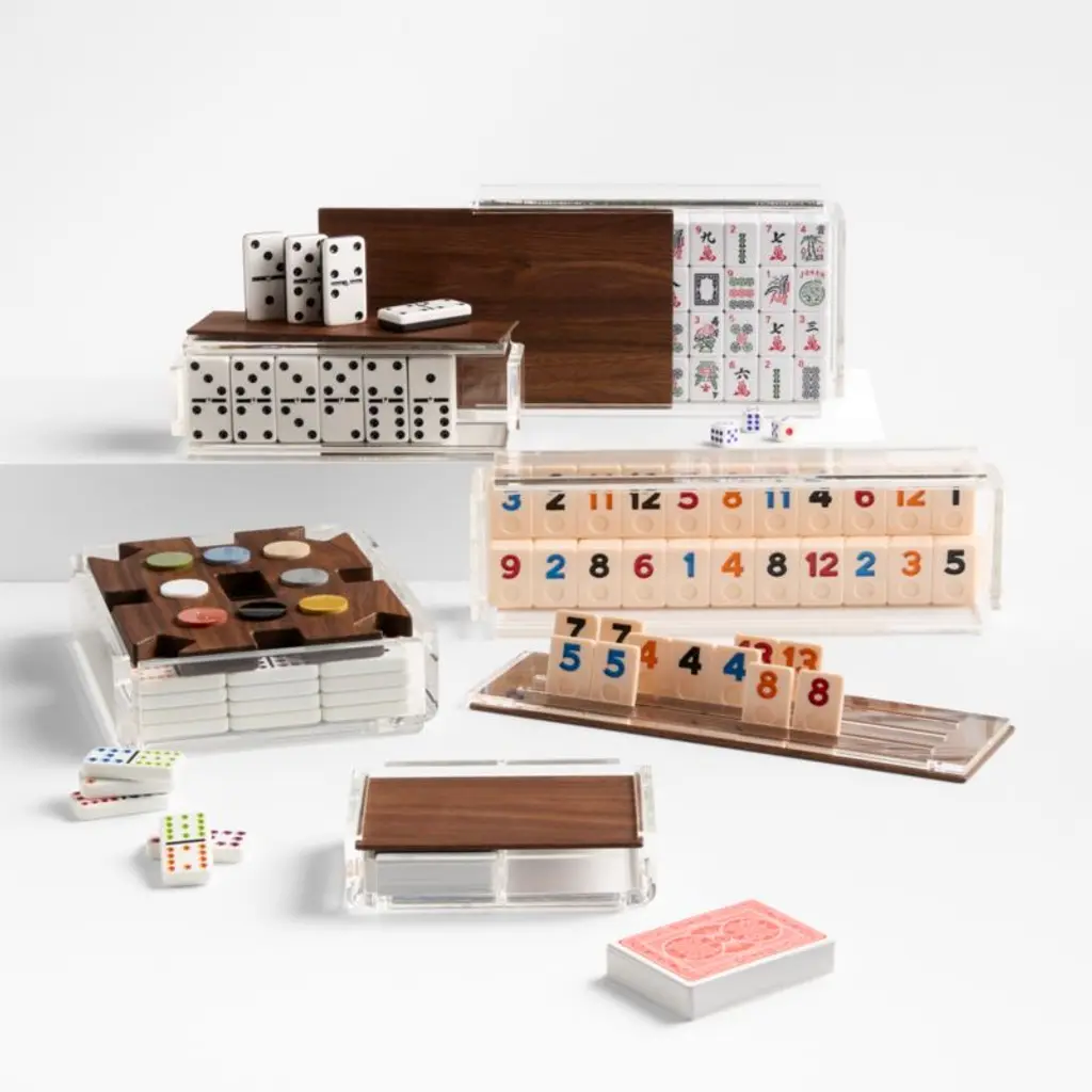 Get in on the fun with this handsome domino set that's meant to be played and displayed. Popular throughout the world, dominoes can be enjoyed in a number of different games. This double-six set features 28 two-tone, tournament-sized domino tiles with brass spinners. The elegant storage box is made of a single piece of clear acrylic that's cut, heated and folded by hand before being flame-polished to a radiant, glass-like finish. A sliding solid walnut lid secures the box while adding an additional layer of luxury.