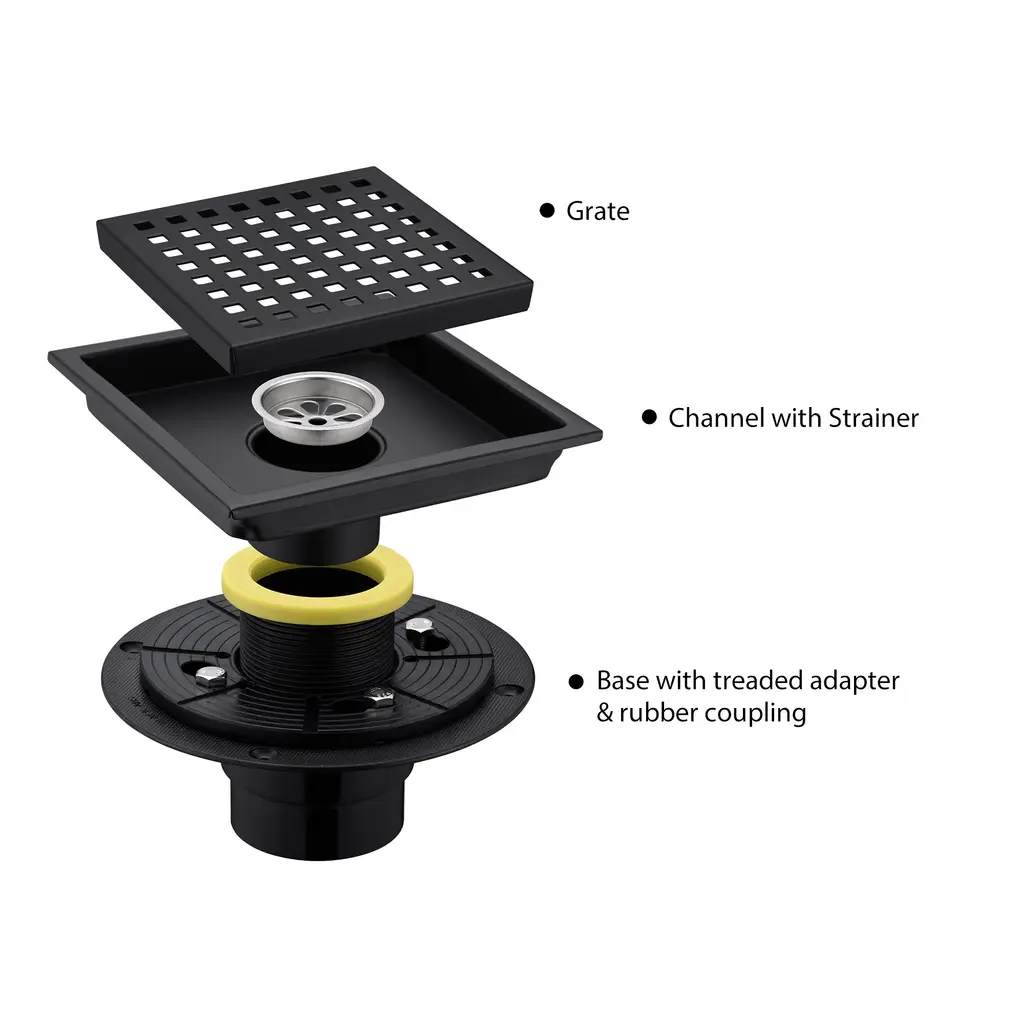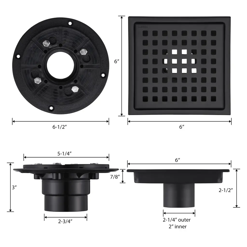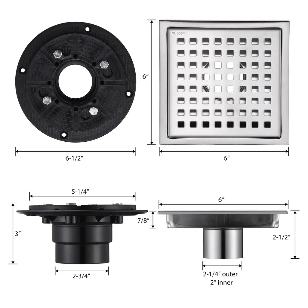 The FD01 square floor drain from LUXIER incorporates a contemporary and sleek design, adding a touch of modernity to any space. It is offered in Stainless Steel, Brushed Gold, Matte Black, and Oil Rubbed Bronze finishes, providing options that complement various bathroom styles. Constructed with stainless steel, this 6 in. x 6 in. floor drain ensures durability and extended functionality. With LUXIER's 2-year warranty, you can make your purchase with assurance and peace of mind.