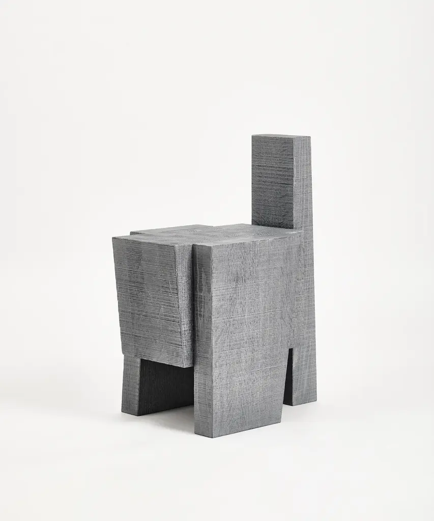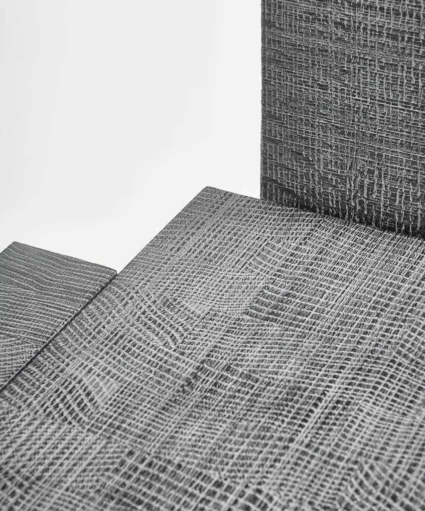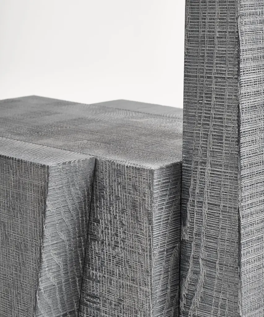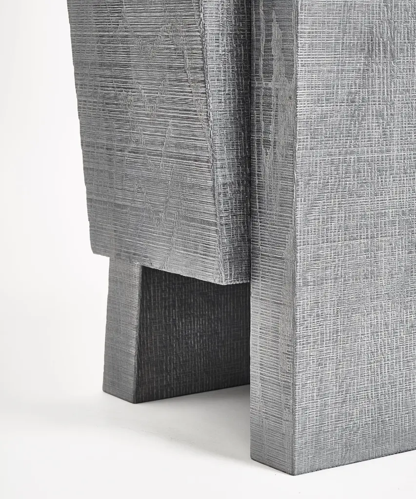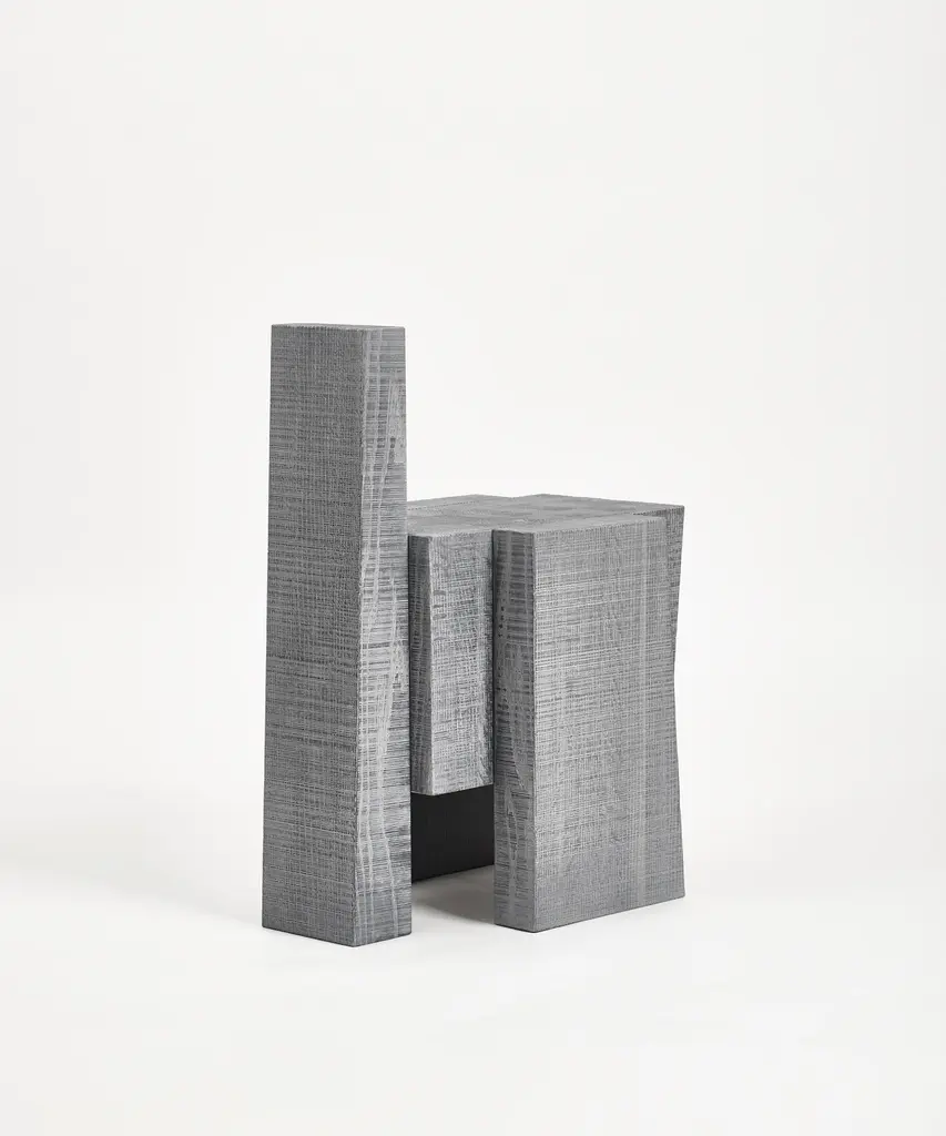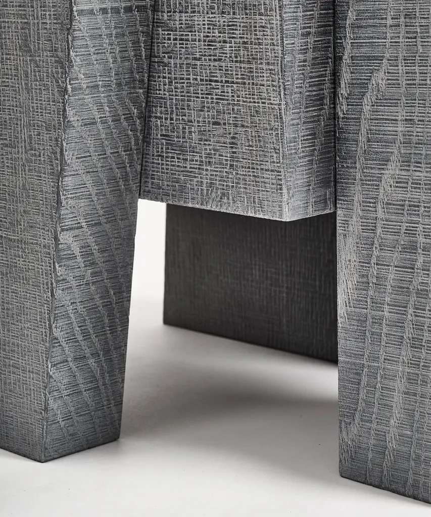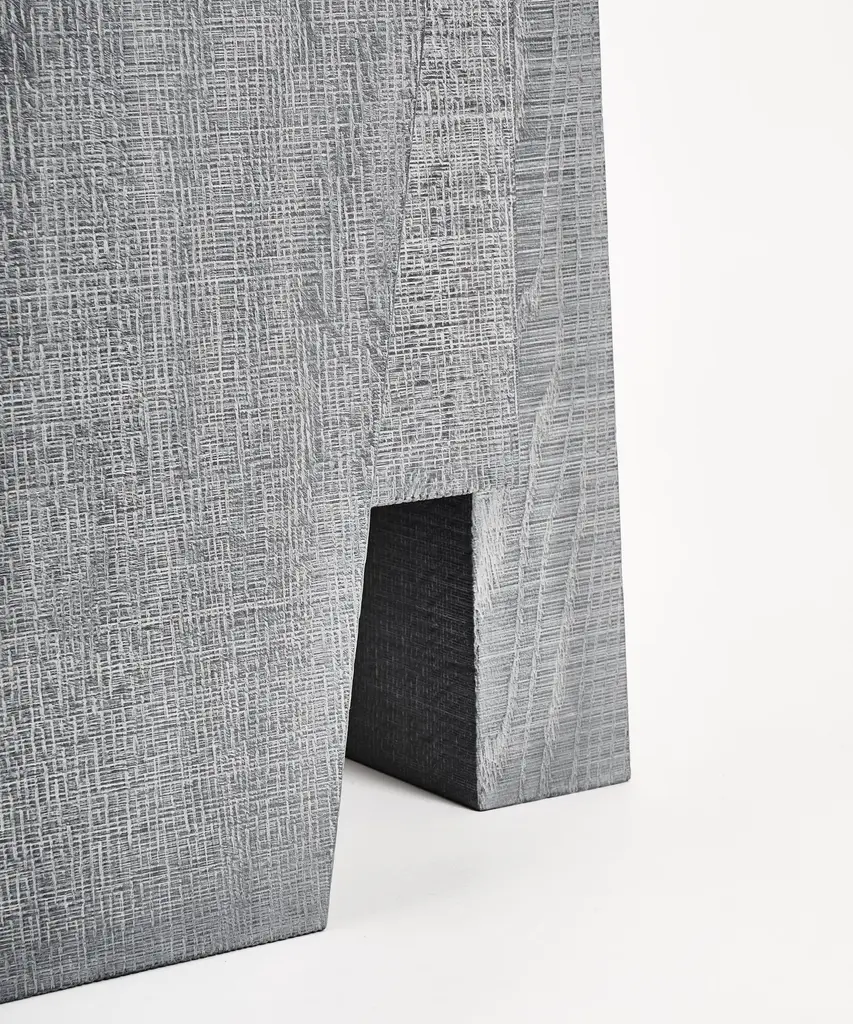 The layered series is the work of stacking materials to make them a basic unit and developing various forms and functions by combining them. Layered wood is as part of the Layered series, a grey-blue finish highlights the alchemic process that produces a natural tannic acid reaction in the red oak wood. The Layered Series is the main concept of Hwang's work. He focuses on experimentation layering materials we can easily find around us to form architectural compositions. This series starts from his childhood memory of an incessantly transforming city full of geometric architecture. Designed by Hyungshin Hwang in Seoul, South Korea.