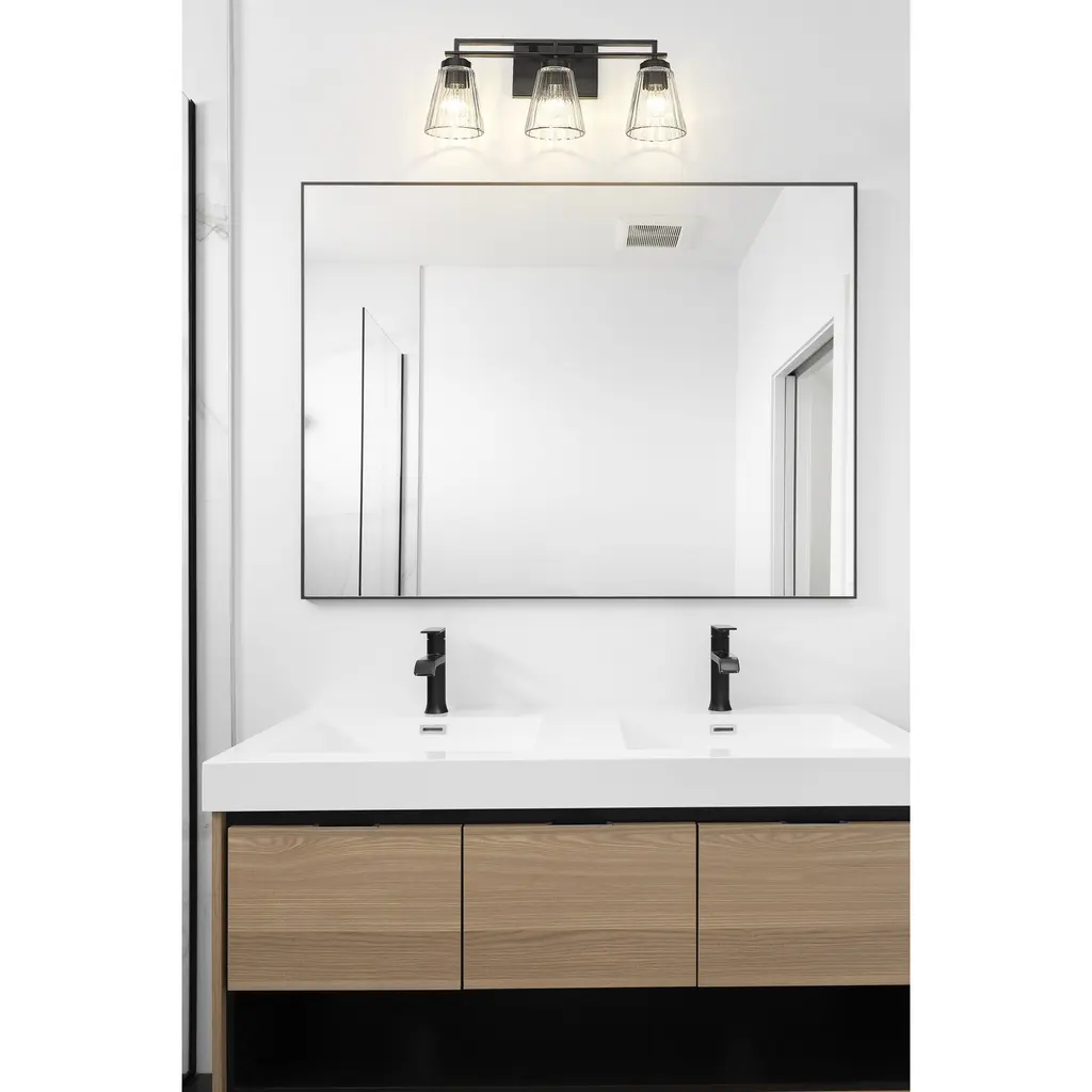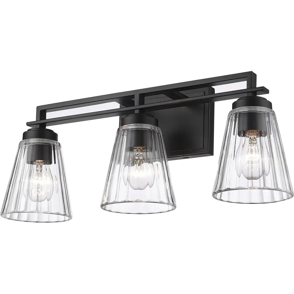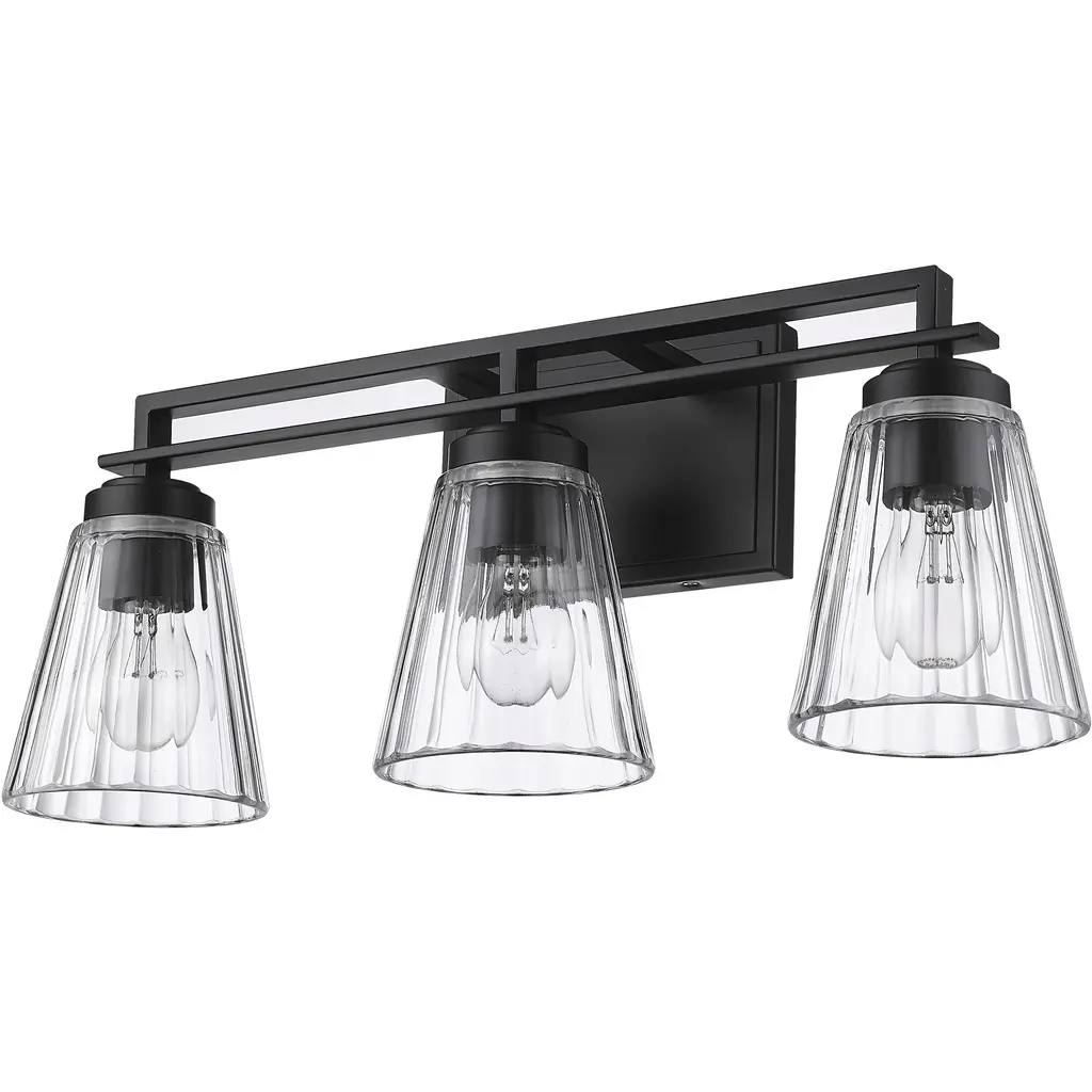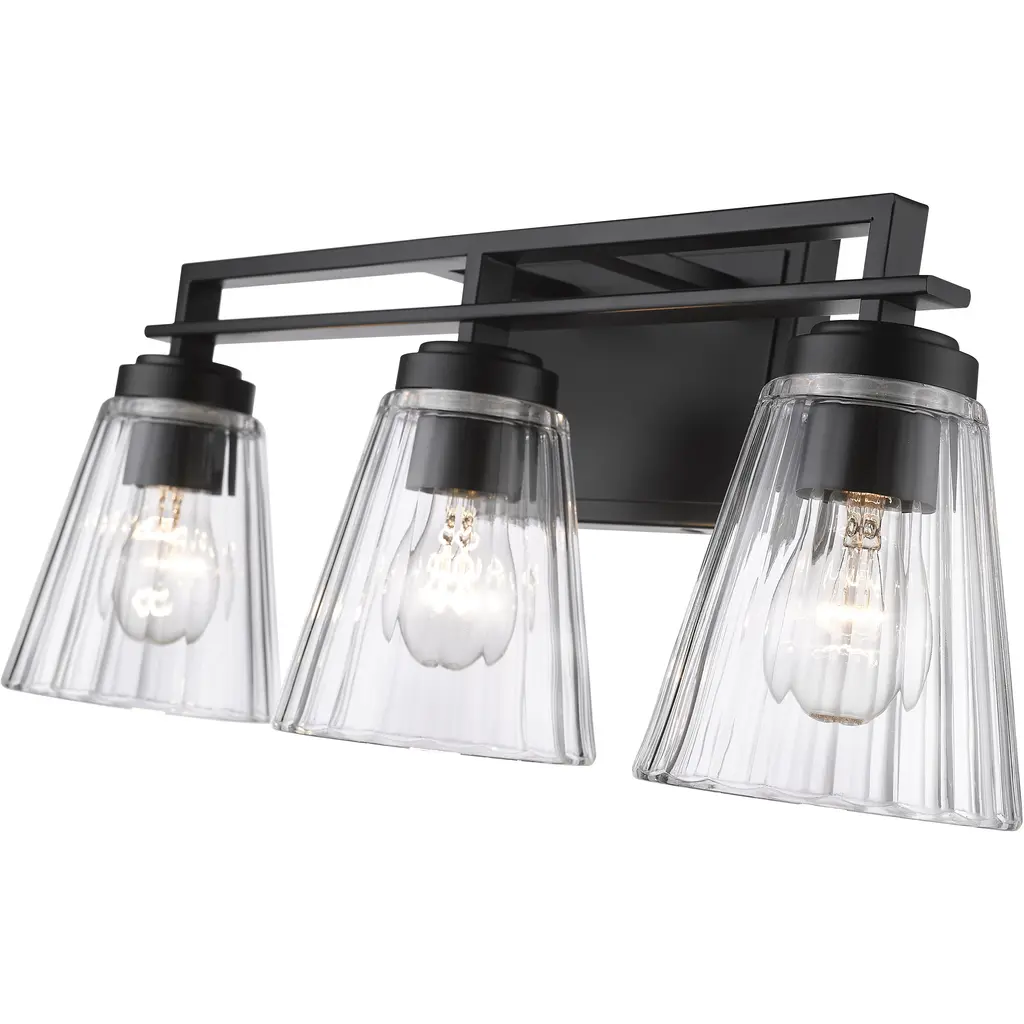 Sophistication and style go hand in hand with a touch of nautical charm, adding an enticing quality to this three-light vanity light. From the Lyna collection, this impressive fixture frames an ensuite or guest bath vanity and creates an optically compelling look. Contemporary and transitional bath spaces come to life with this fixture featuring gleaming clear ribbed glass cone shades and a detailed matte black finish steel frame.