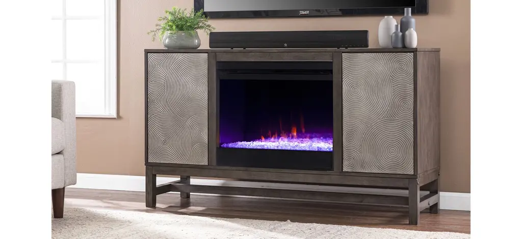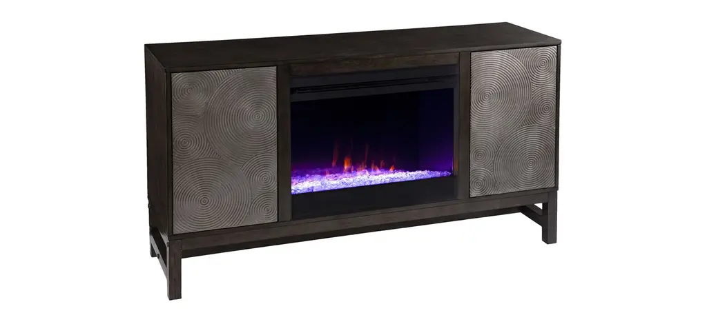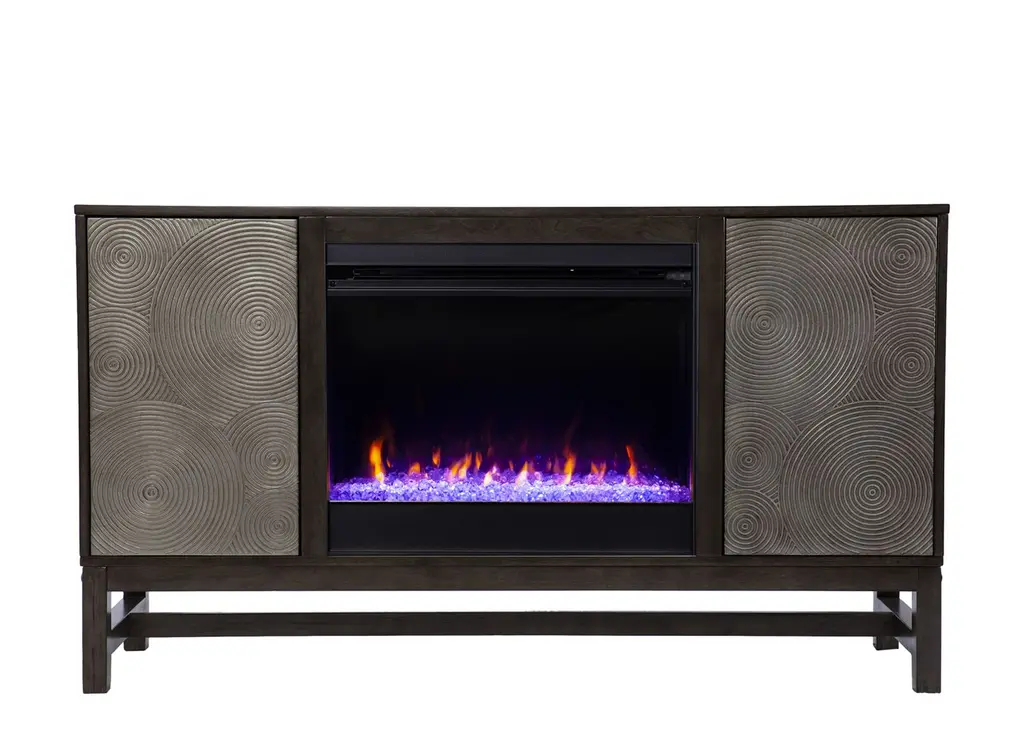 Modernize your cozy living space with this Lyon Fireplace. Textured doors tuck away movies and books, while adjustable shelves let you customize your storage space. Shimmering faux crystal adds ambiance with flickering LED flames, alternating colors, and lifelike embers, all from the convenience of your sofa. Turn up the heat in style with this electric media fireplace.