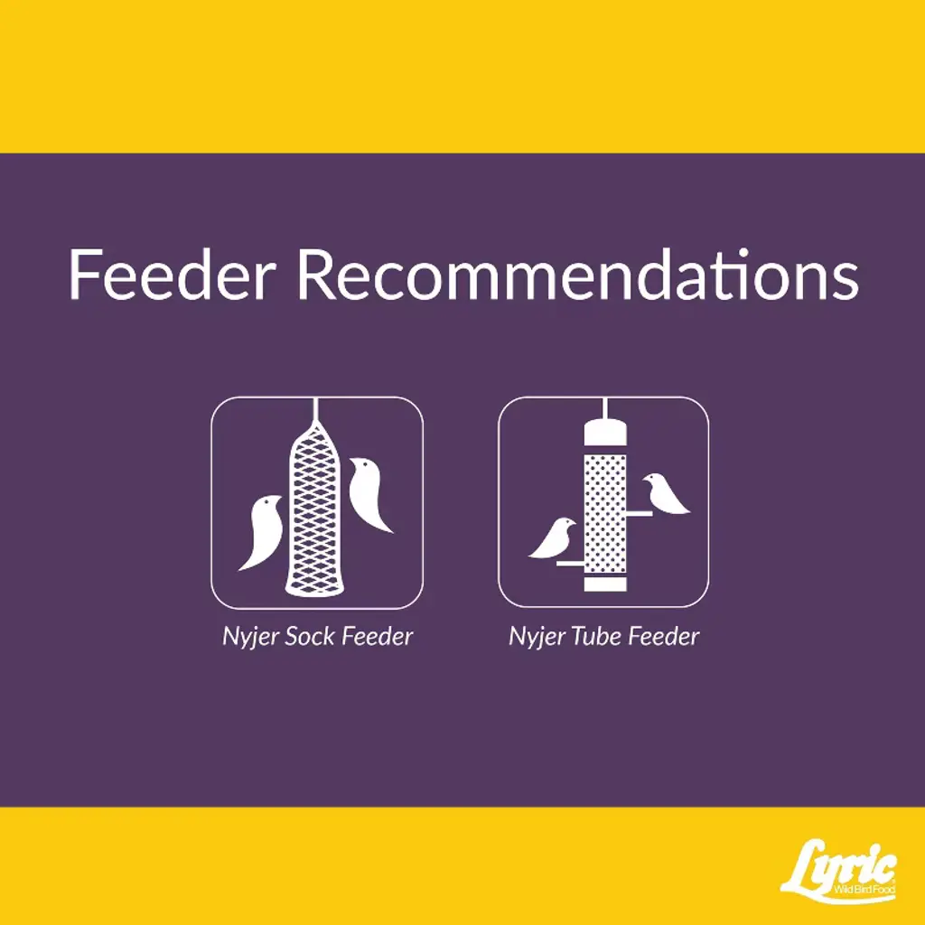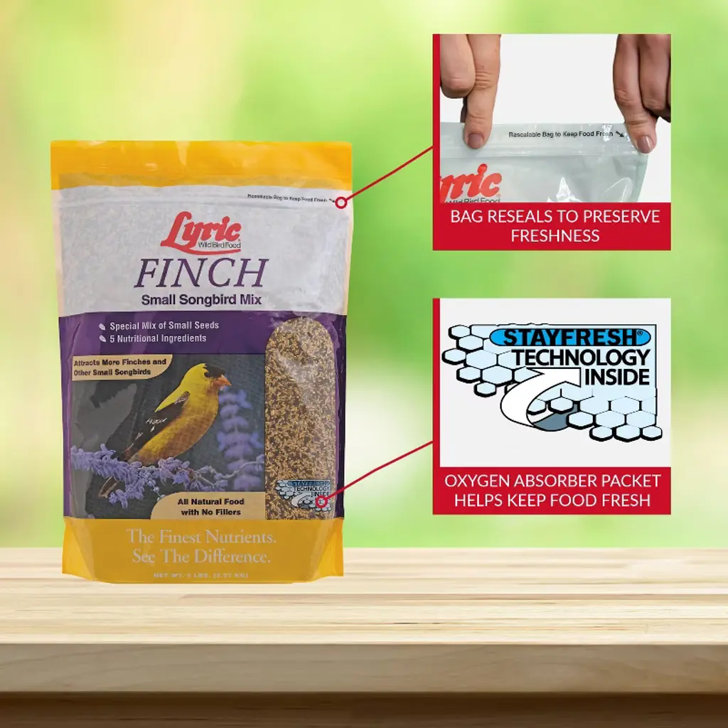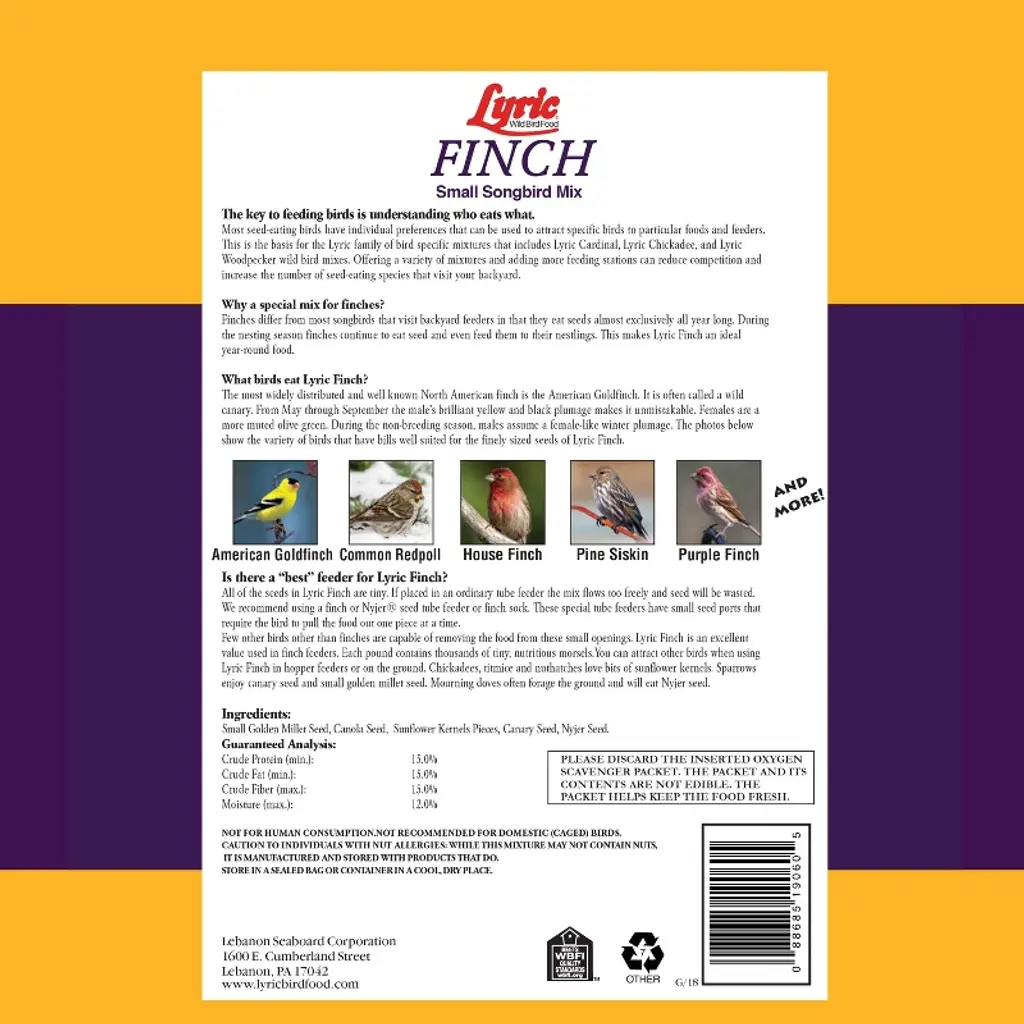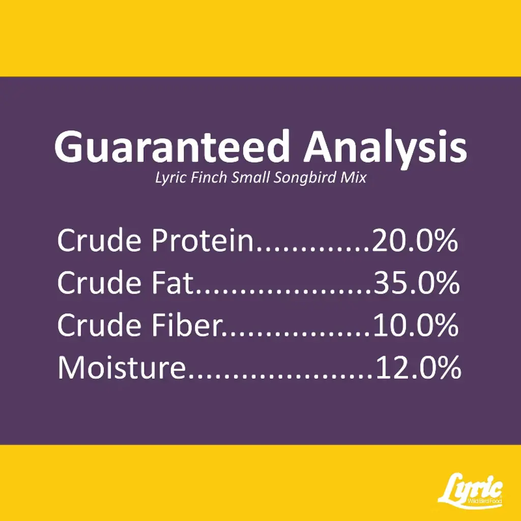 Lyric Finch Small Songbird Mix is the perfect treat for your feathered friends visiting your backyard bird feeders. Lyric Finch Small Songbird Mix is a mix specially designed for finches. Finches differ from most wild songbirds in that they eat seeds almost exclusively all year long. This bird feed mix contains canary seeds, canola seeds, Nyjer seeds, small golden millet seeds, and sunflower kernels pieces. These seeds fuel the birds' high level of daily activity - whether they're foraging for food in the winter or building nests in the spring. Lyric Finch Mix can be used in tube feeders, sock feeders, and hopper feeders. Place the wild bird feed in the bird feeders and enjoy watching as the Lyric Finch Small Songbird Mix attracts songbirds like American Goldfinches, Common Redpolls, House Finches, Pine Siskins, Purple Finches, and more!