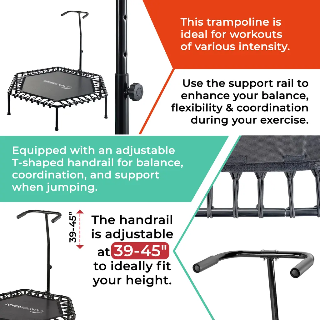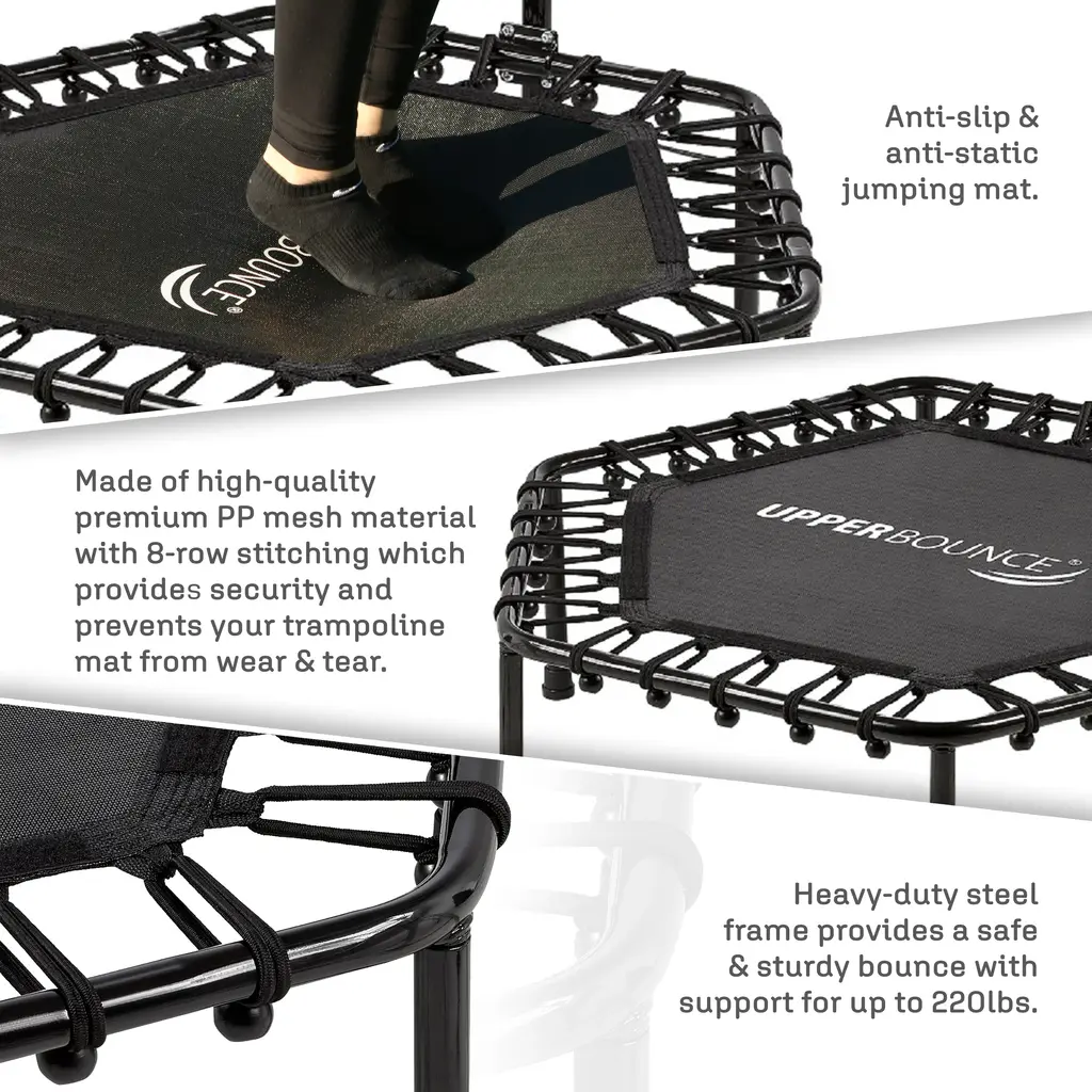 Machrus Upper Bounce 50" Mini Trampoline With Adjustable T-Shaped Handrail - Hexagonal Rebounder Fitness Trampoline - Black