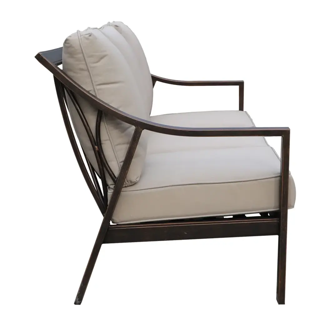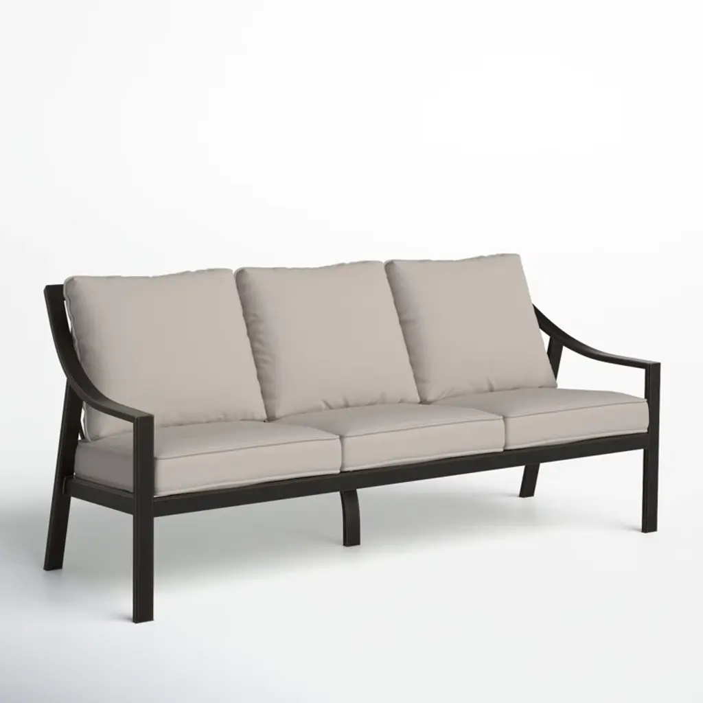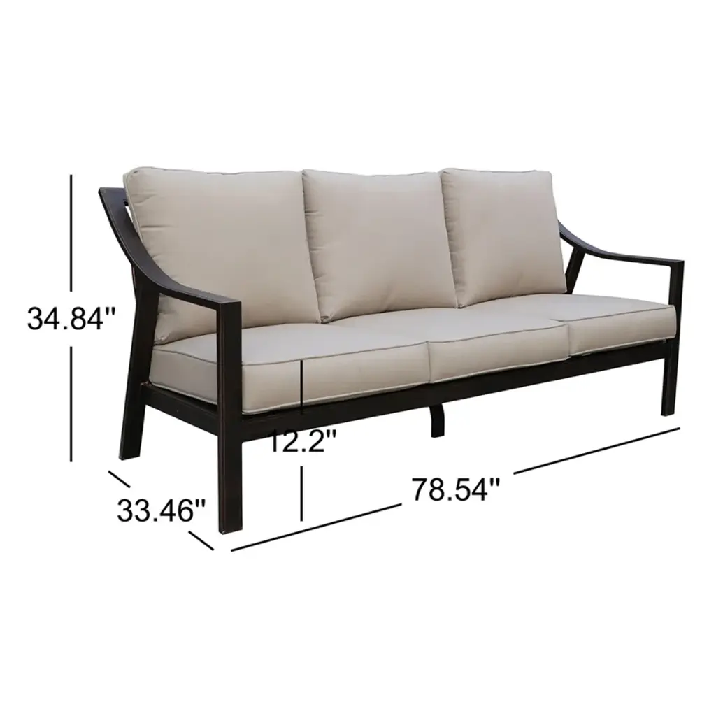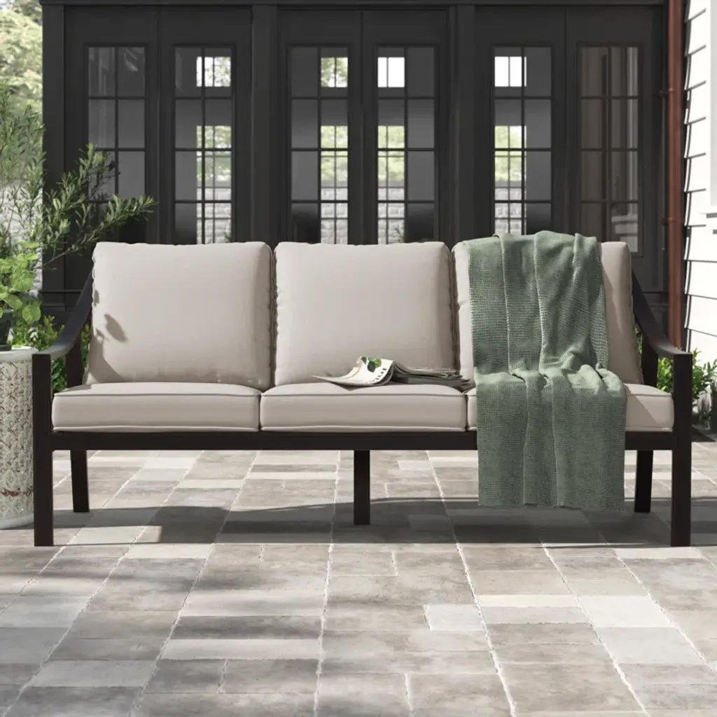 This patio sofa is just the right addition to your outdoor oasis, whether it's on your front porch or back patio. Since it's made with a powder-coated aluminum frame, it's water-, UV-, and rust resistant. Go ahead, leave this sofa outside in any season. Its understated frame has sloped arms, a slatted seat, and curved openwork designs on the back that let water run right through. We included water-repellent and UV-protective piped cushions to keep you comfortable while the sun goes down. Plus, this outdoor sofa is backed by a 2-year limited warranty from the manufacturer.