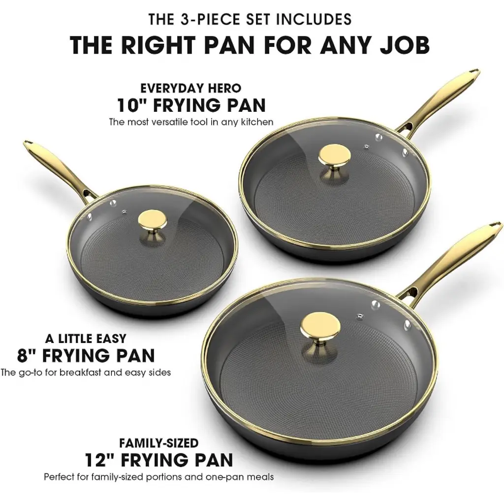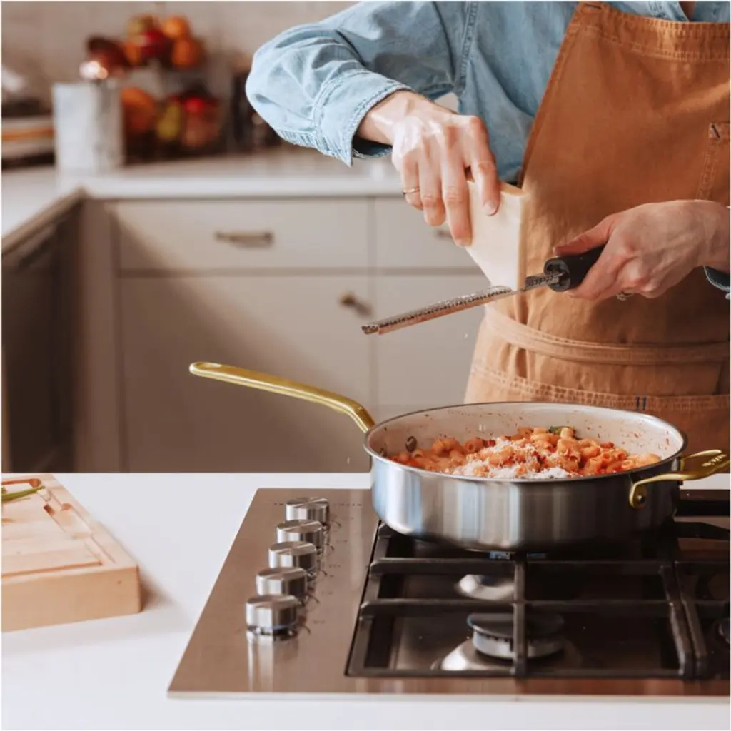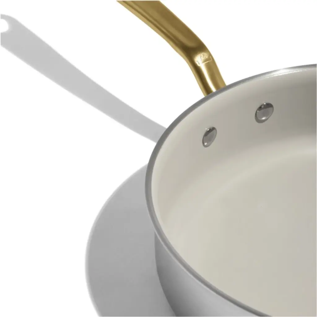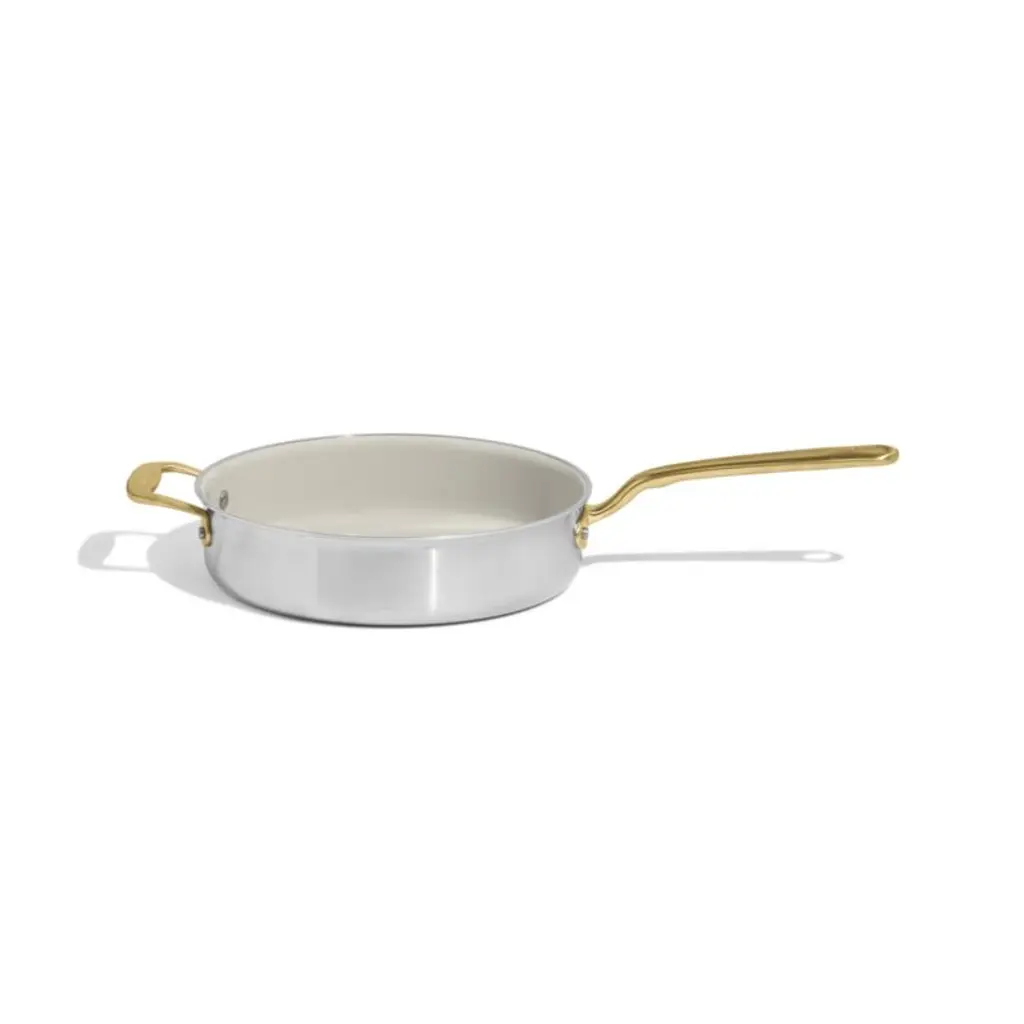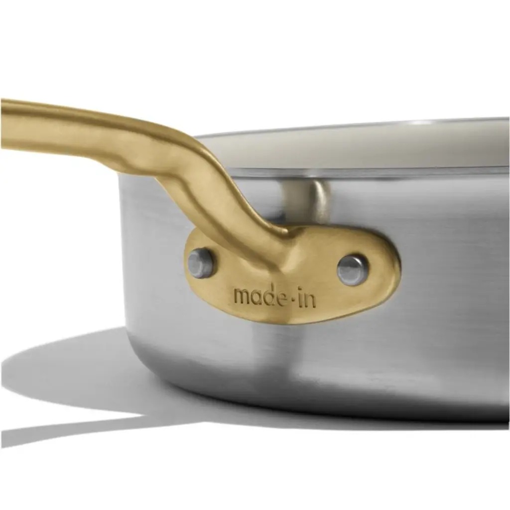 Italian-made CeramiClad cookware from Made In brings professional-level quality and durability home. Five-ply construction envelops a triple aluminum core for optimal heat conduction in stainless steel finished with a cream-hued ceramic non-stick cooking surface. The layered structure eliminates hot spotsmeaning less stuck-on food and less scrubbing. Constructed with high walls ideal for braising or reducing pan sauces, the saute pan offers a large surface area for optimal browning, searing and sauteing. Stay-cool handles with a gleaming antique brass finish make the pan comfortable to carry, and the lid seals in heat and steam. Timeless with traditional styling, the saute pan pairs with our other Made In cookware to outfit your kitchen beautifully.