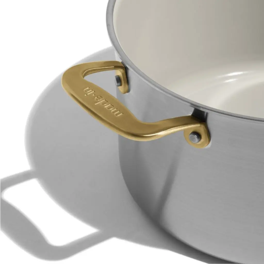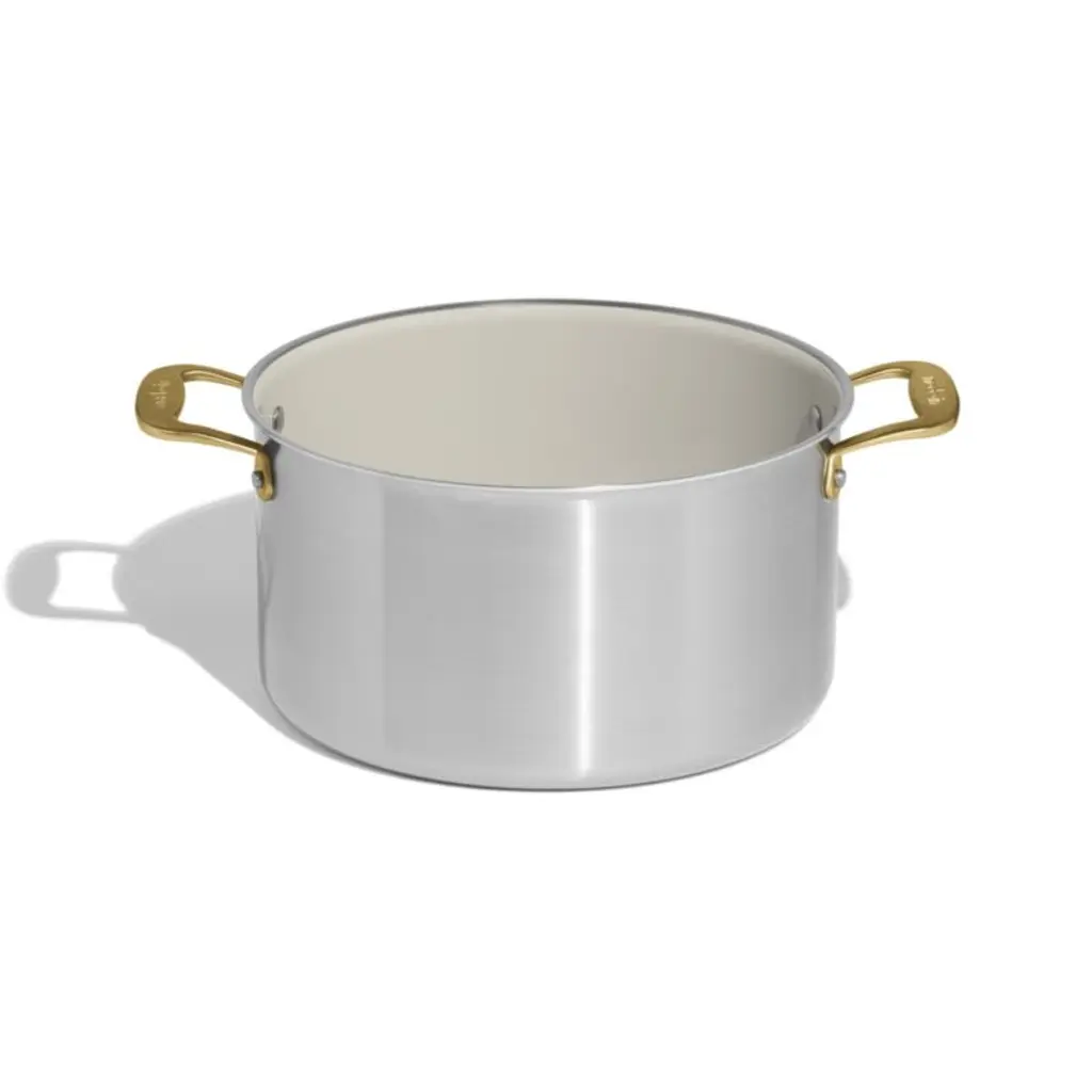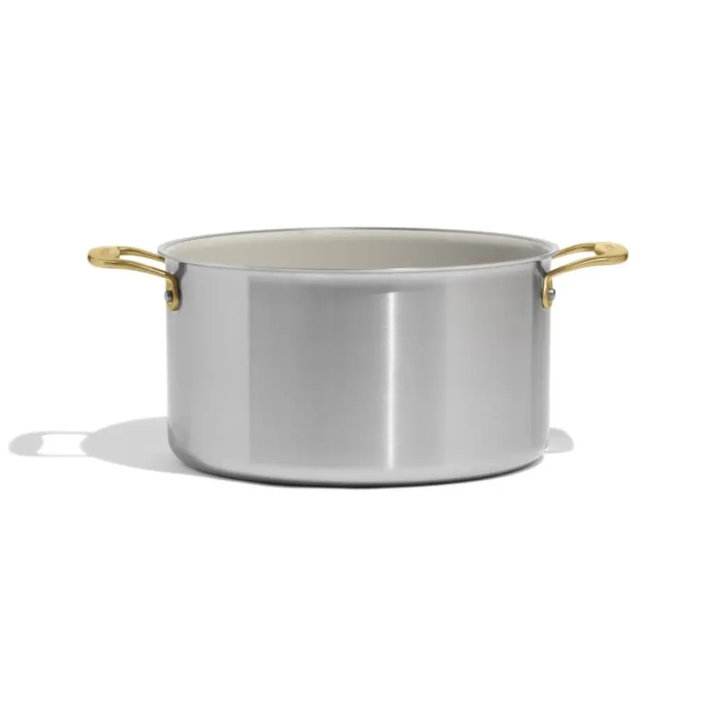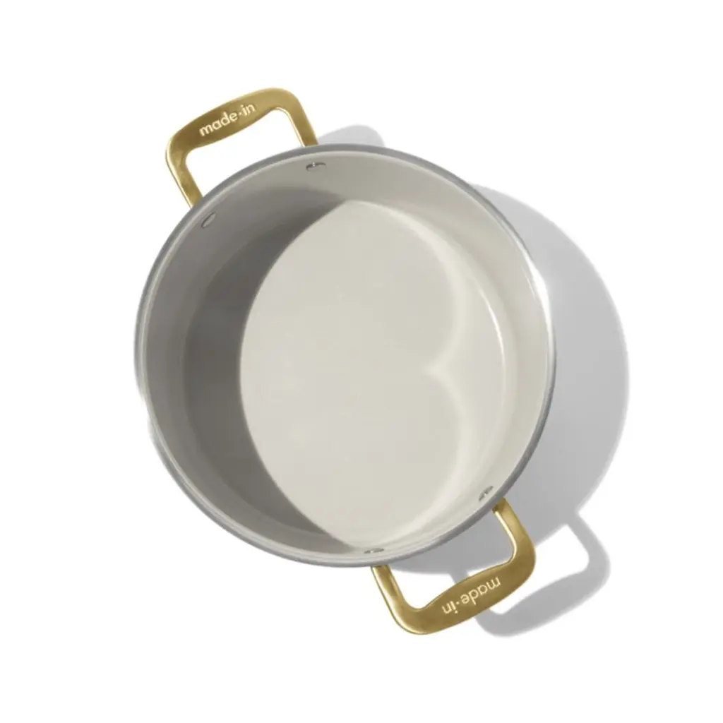 Italian-made CeramiClad cookware from Made In brings professional-level quality and durability home. Five-ply construction envelops a triple aluminum core for optimal heat conduction in stainless steel finished with a cream-hued ceramic non-stick cooking surface. The layered structure eliminates hot spotsmeaning less stuck-on food and less scrubbing. Perfectly sized for simmering, braising and boiling, the stockpot is topped with a tight-fitting lid that helps bring water to a boil in mere minutes. Stay-cool loop handles with a gleaming antique brass finish that's exclusive to Crate & Barrel make the pan comfortable to carry. Timeless with traditional styling, the stockpot pairs with our other Made In cookware to outfit your kitchen beautifully.