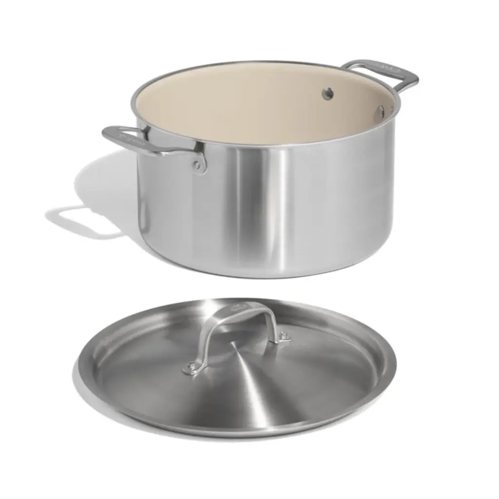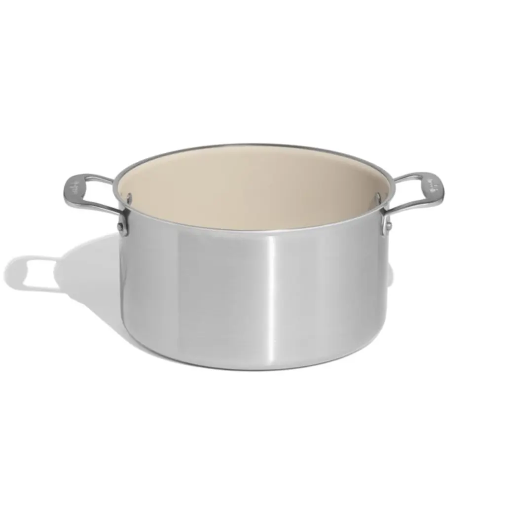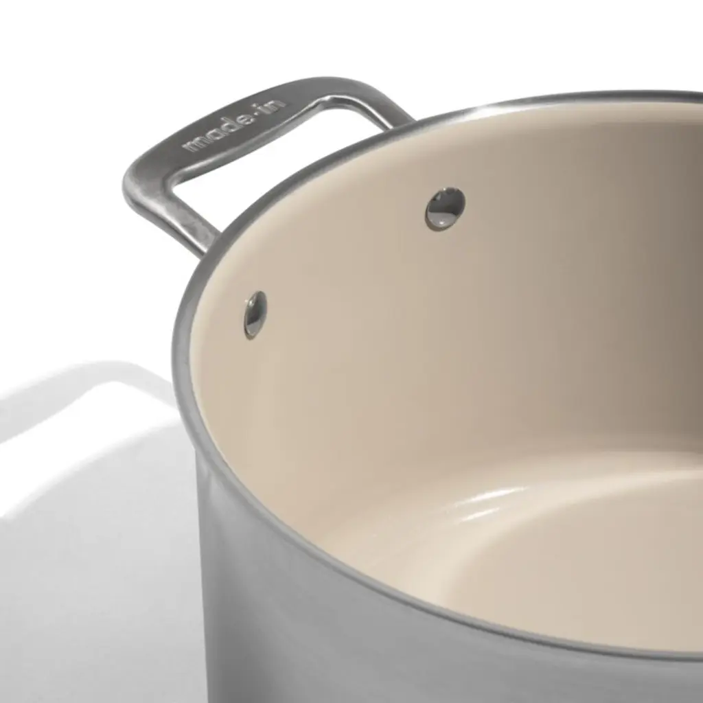 Italian-made CeramiClad cookware from Made In brings professional-level quality and durability home. Five-ply construction envelops a triple aluminum core for optimal heat conduction in stainless steel finished with a cream-hued ceramic non-stick cooking surface. The layered structure eliminates hot spotsmeaning less stuck-on food and less scrubbing. Perfectly sized for simmering, braising and boiling, the stockpot is topped with a tight-fitting lid that helps bring water to a boil in mere minutes. Stay-cool loop handles make the pan comfortable to carry. Timeless with traditional styling, the stockpot pairs with our other Made In cookware to outfit your kitchen beautifully.