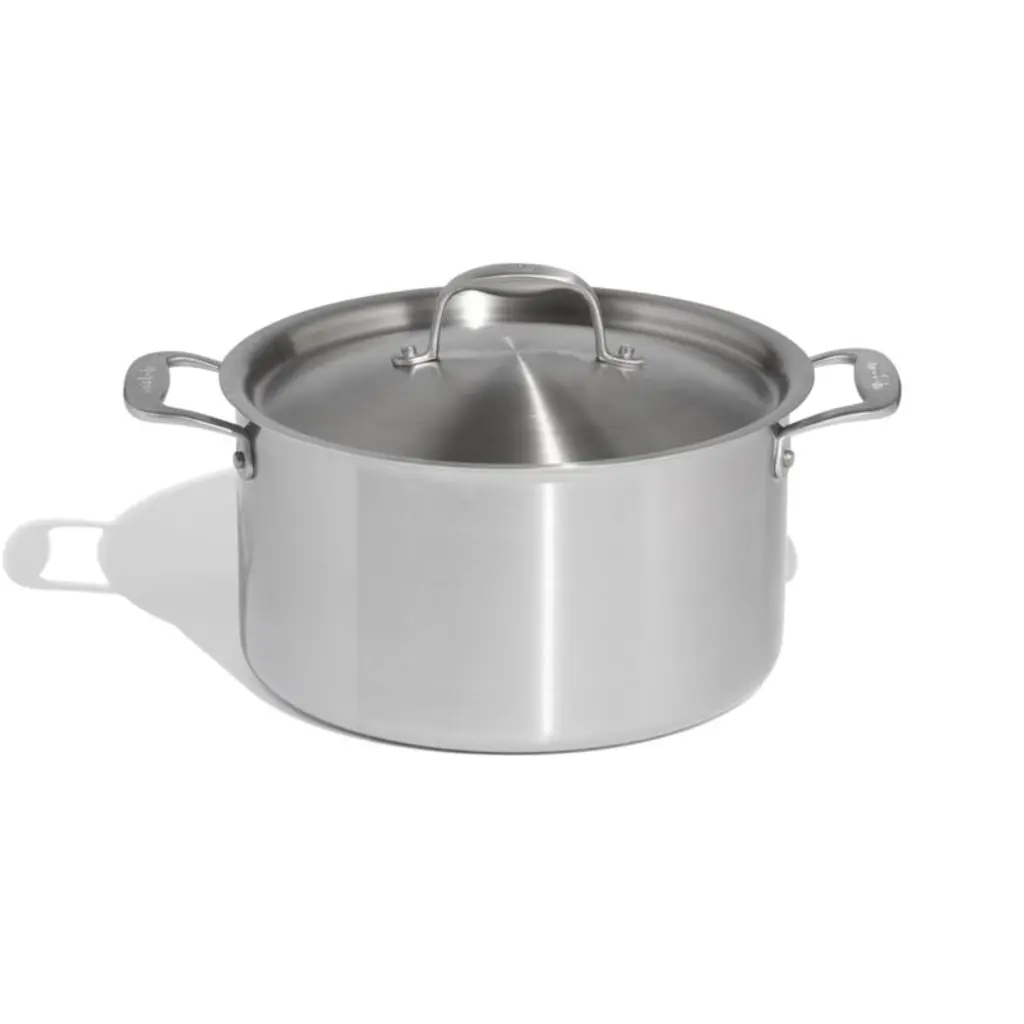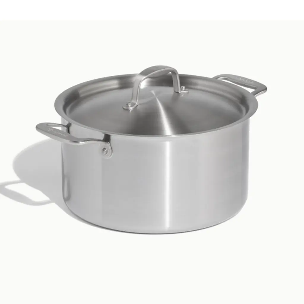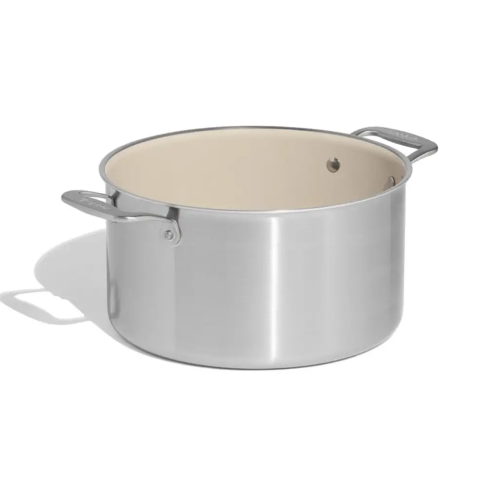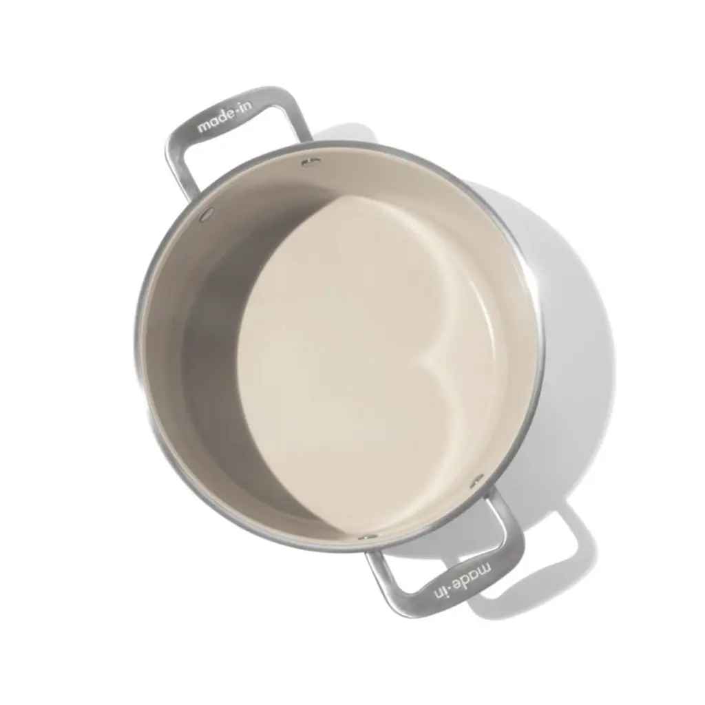 Italian-made CeramiClad cookware from Made In brings professional-level quality and durability home. Five-ply construction envelops a triple aluminum core for optimal heat conduction in stainless steel finished with a cream-hued ceramic non-stick cooking surface. The layered structure eliminates hot spotsmeaning less stuck-on food and less scrubbing. Perfectly sized for simmering, braising and boiling, the stockpot is topped with a tight-fitting lid that helps bring water to a boil in mere minutes. Stay-cool loop handles make the pan comfortable to carry. Timeless with traditional styling, the stockpot pairs with our other Made In cookware to outfit your kitchen beautifully.