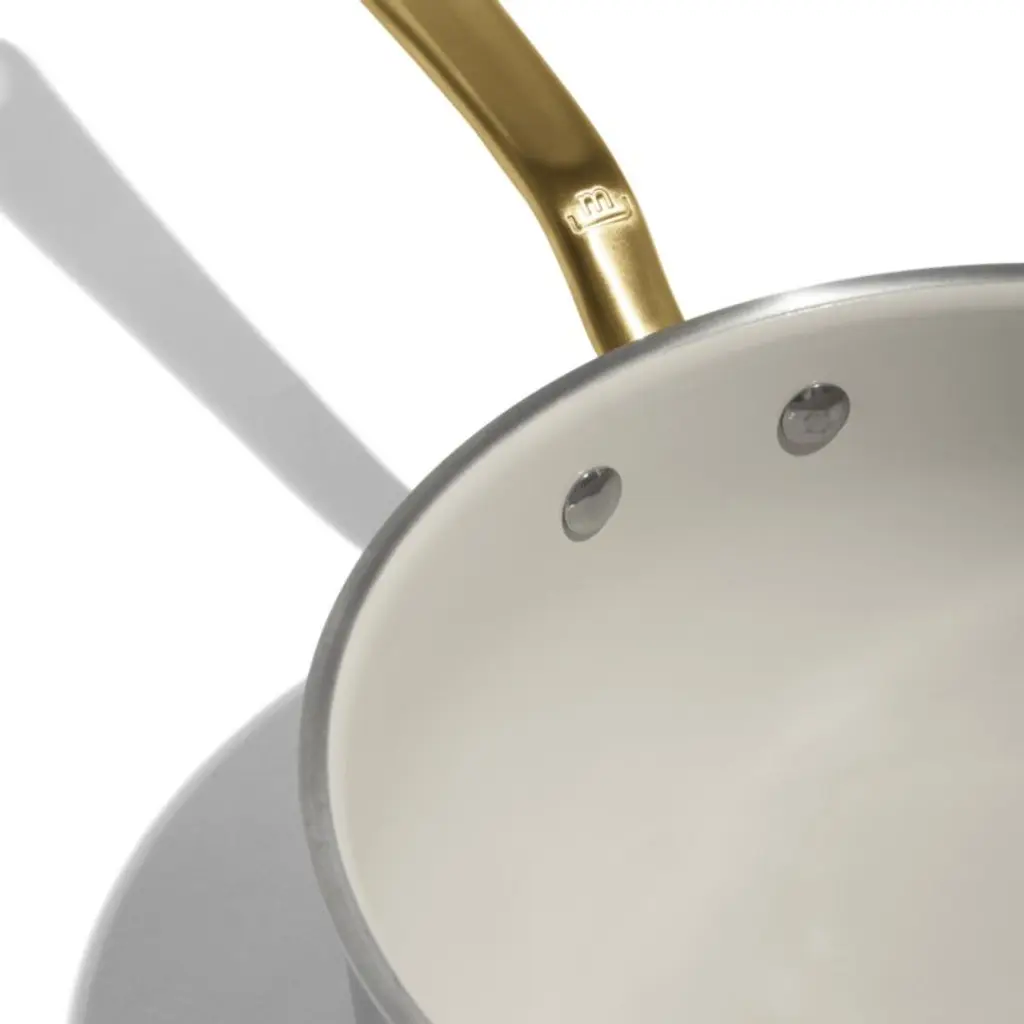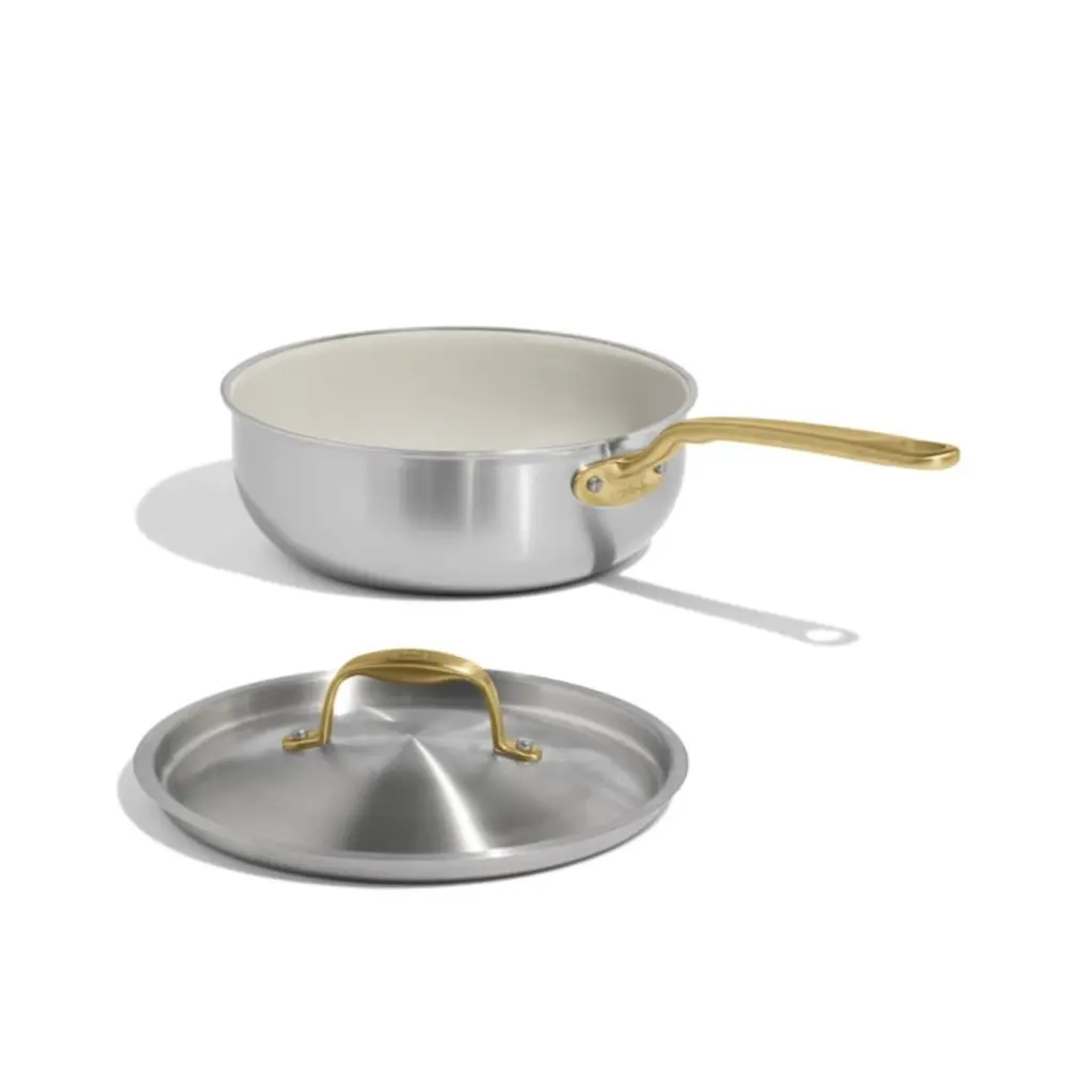 Italian-made CeramiClad cookware from Made In brings professional-level quality and durability home. Five-ply construction envelops a triple aluminum core for optimal heat conduction in stainless steel finished with a sand-hued ceramic non-stick cooking surface. The layered structure eliminates hot spotsmeaning less stuck-on food and less scrubbing. Impeccably designed for cooking sauces to silky perfection, the saucier is constructed without corners to enable thorough whisking and emulsification. Stay-cool handles with a gleaming antique brass finish that's exclusive to Crate & Barrel make the pan comfortable to carry, and the lid seals in heat and steam. Timeless with traditional styling, the saucier pairs with our other Made In cookware to outfit your kitchen beautifully.