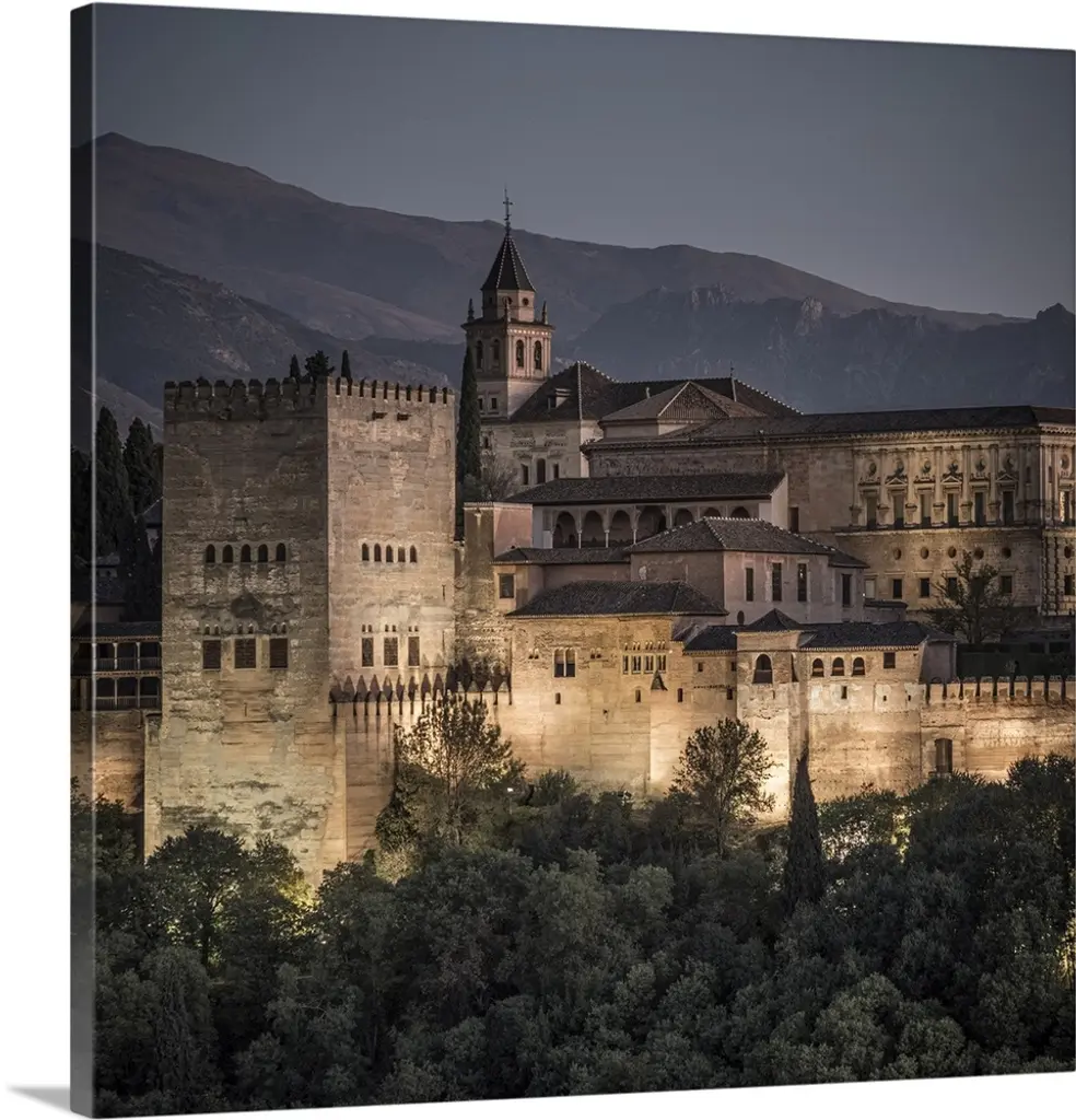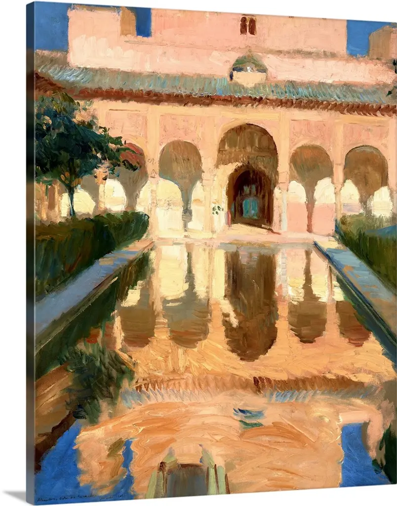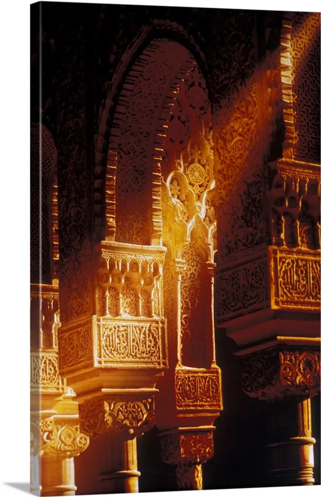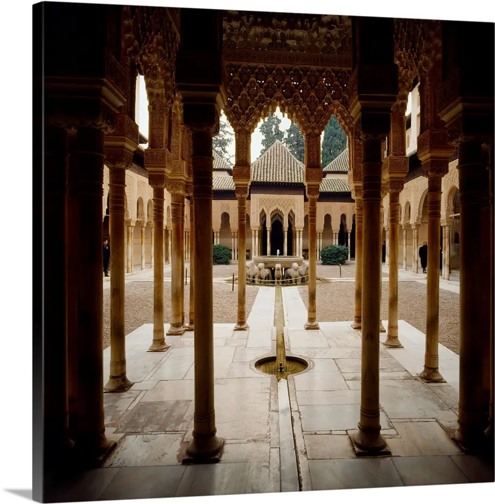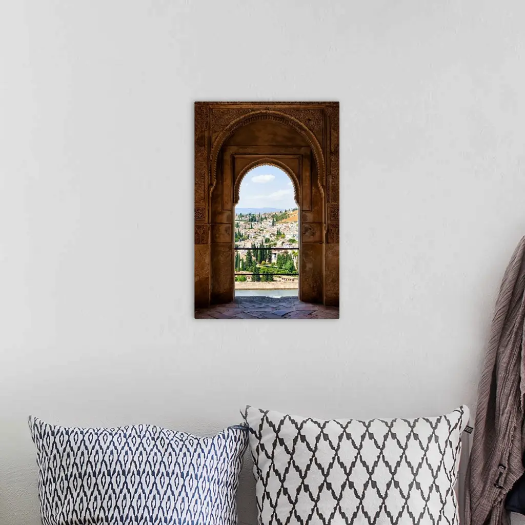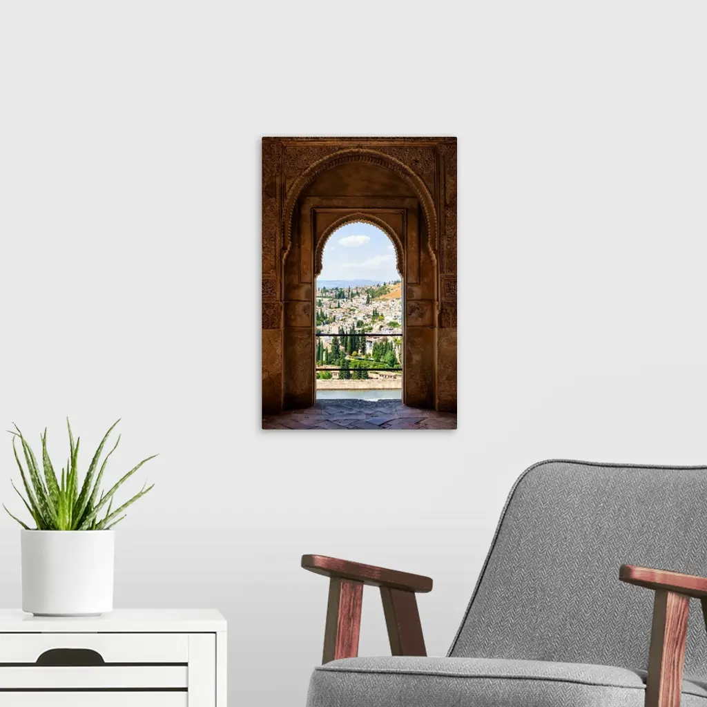 It's a view of the city of Granada by the ancient arches of the Alhambra, Spain.
