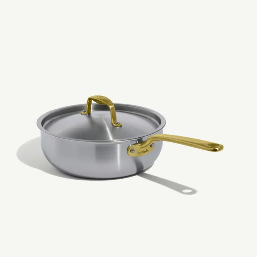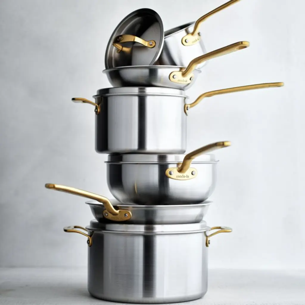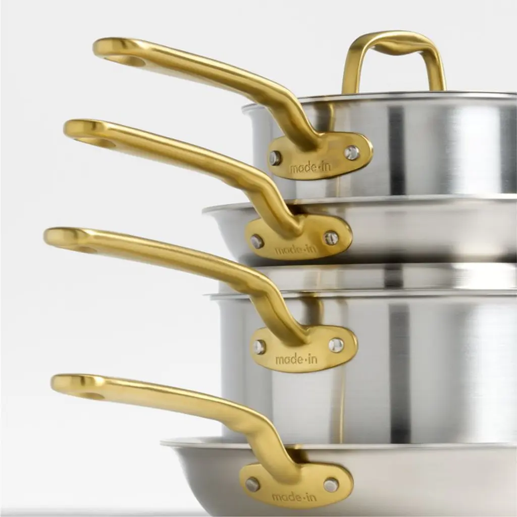 This Italian-made stainless steel cookware set from Made In brings professional-level quality and durability home. Five-ply construction envelops a triple aluminum core for optimal heat conduction in stainless steel cladding. The cooking surfaces are non-reactive, the magnetic exteriors are induction compatible, and the layered structure eliminates hot spots (meaning less stuck-on food and less scrubbing). The saucier cooks silky, impeccably emulsified sauces, while the saucepan simmers precisely. A pair of frying pans sear and fry to crispy perfection, and the stockpot boils braises. Stay-cool handles with a gleaming antique brass finish that's exclusive to Crate & Barrel make the pans comfortable to carry, and rolled rims ensure easy pouring and restaurant-worthy plating. Timeless with traditional styling, this 10-piece cookware set pairs with our other Made In cookware to outfit your kitchen beautifully.
